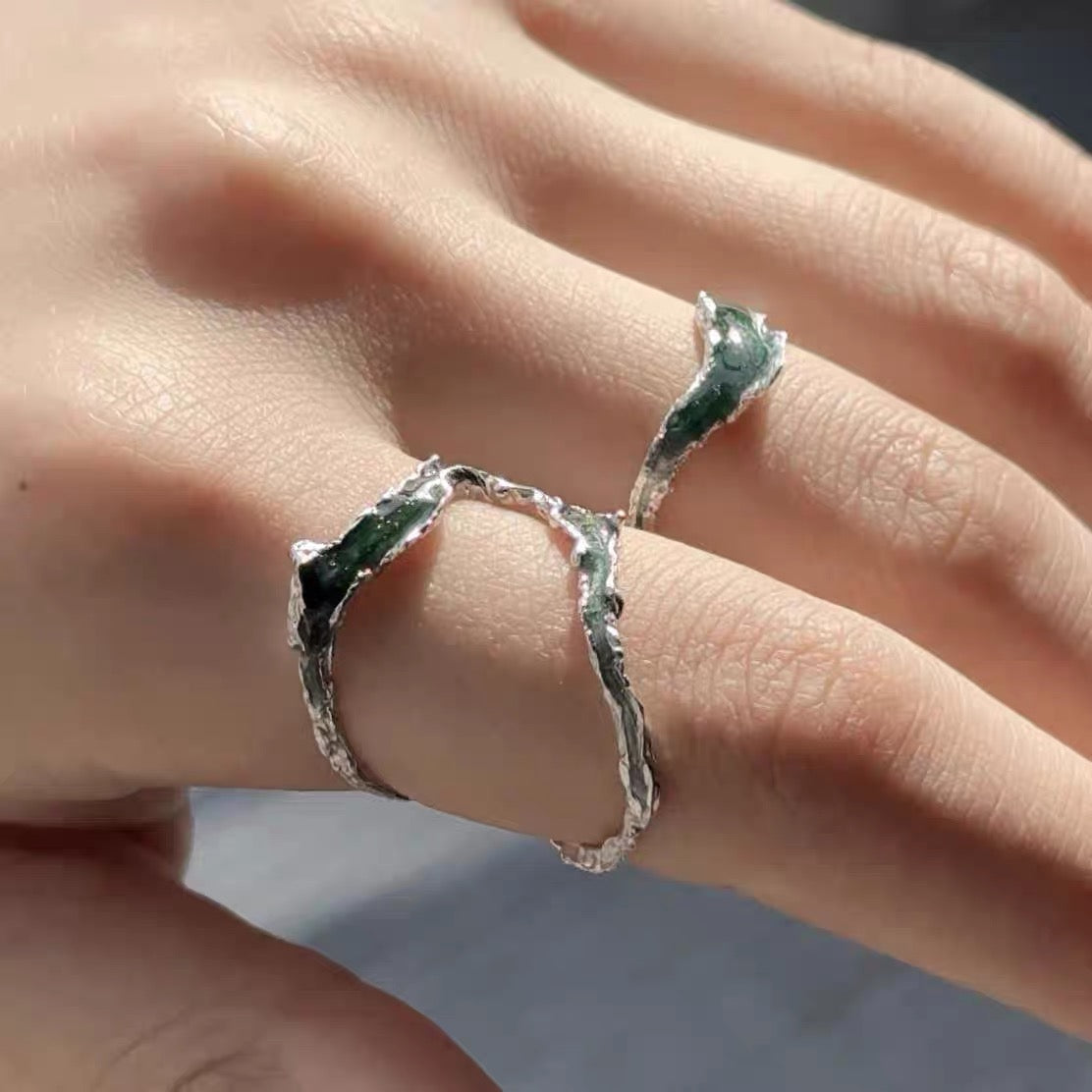 Inspireret af de organiske kurver i strømmende floder, indfanger denne håndlavede sølvring den stille styrke og skønhed af vand i bevægelse. Den skulpturelle, teksturerede ring har flydende bølger af dybgrøn emalje, der fremkalder den fredfyldte energi i naturens vandløb og tidevand.