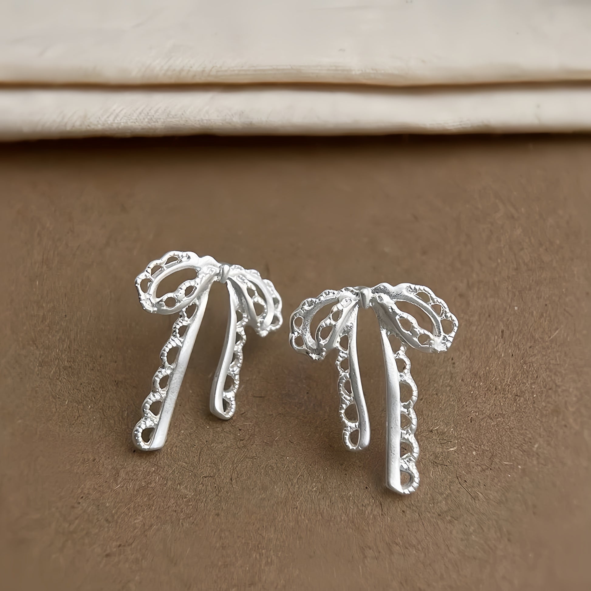 Bløde, flydende og stille kraftfulde – disse båndinspirerede dråbeøreringe er designet til at bevæge sig med dig. Silhuetten minder om en blidt bundet sløjfe, hvor polerede metalbånd falder nedad og møder en delikat blondelignende kant – et samspil mellem styrke og blødhed, struktur og poesi.