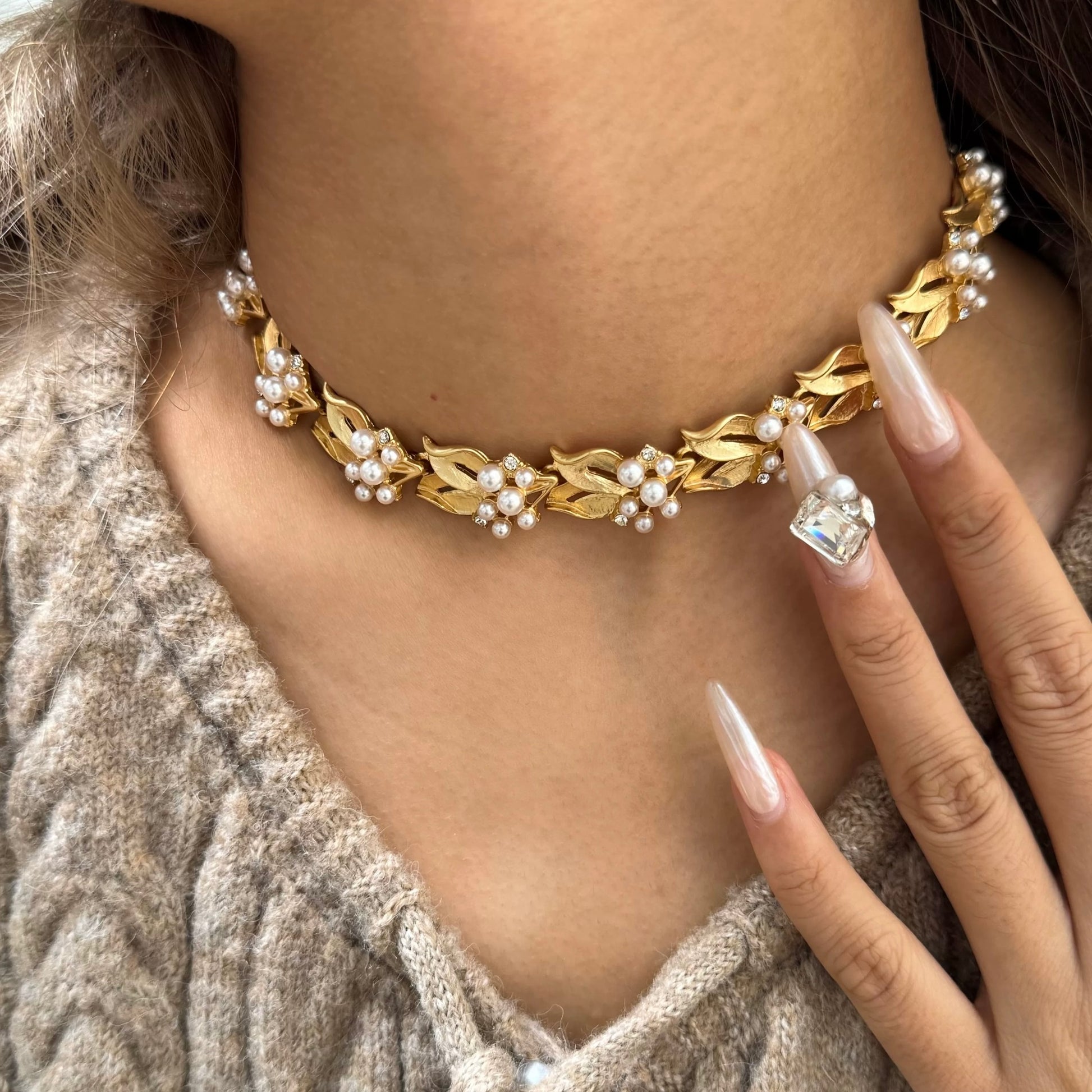 Elevate your elegance with the Pearl Leaf Set, a stunning pairing of necklace and bracelet inspired by vintage botanical motifs. Crafted with intricate gold-tone leaves and clustered with luminous faux pearls and delicate crystal accents, each piece radiates timeless femininity and floral grace.