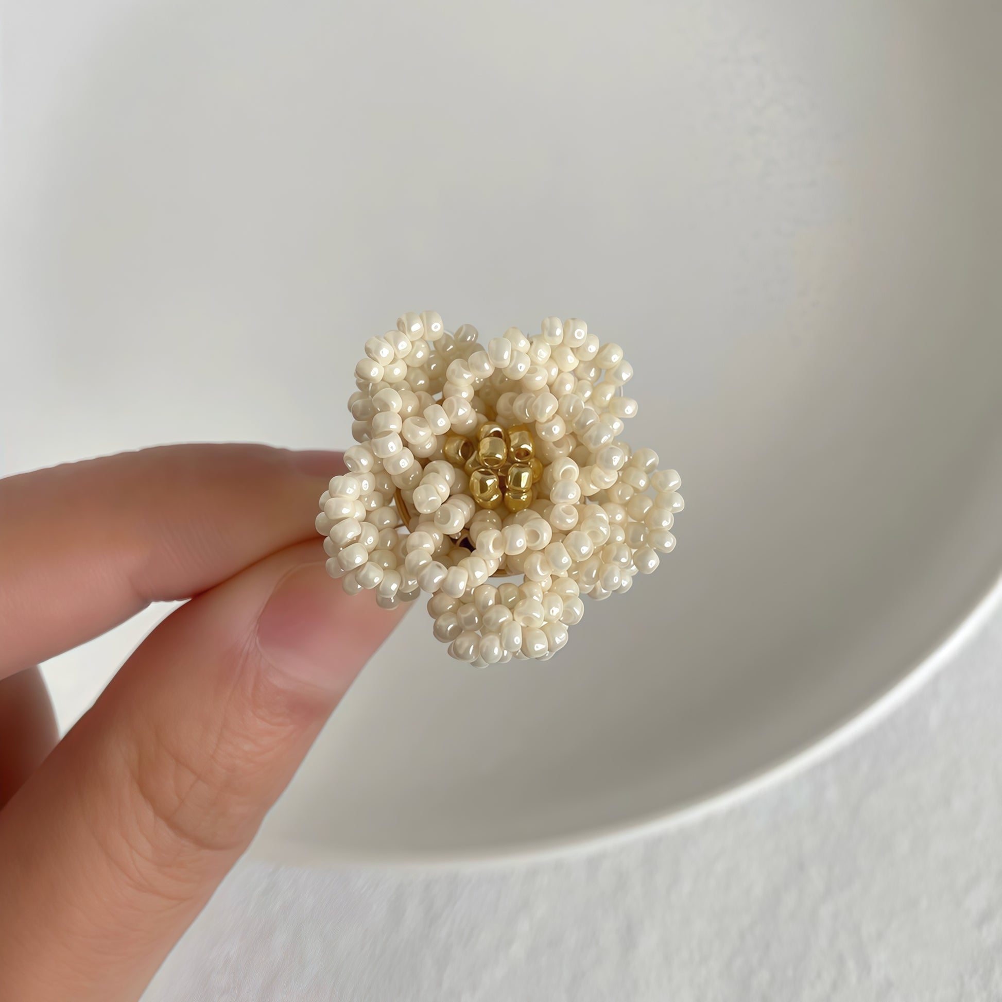 A sculptural flower in full bloom, this adjustable ring is intricately woven from tiny white beads with a golden accent center. Its bold yet graceful design makes it the ultimate statement piece — a symbol of beauty and strength you can wear every day.