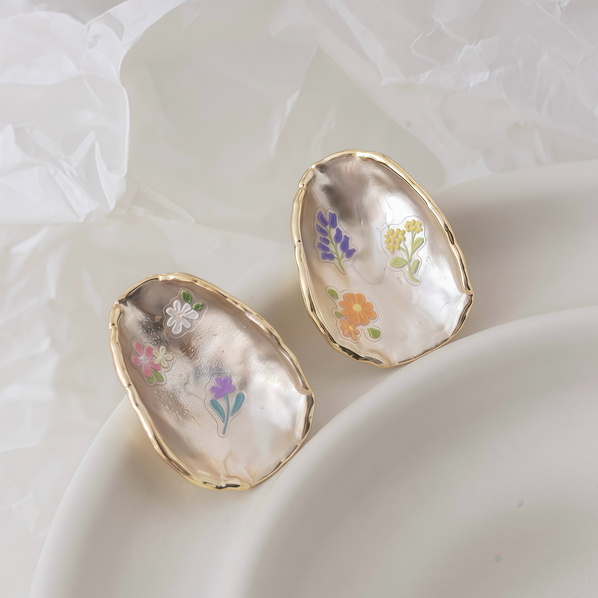 Every pair tells its own miniature story: two tiny worlds blooming gently beside your face.