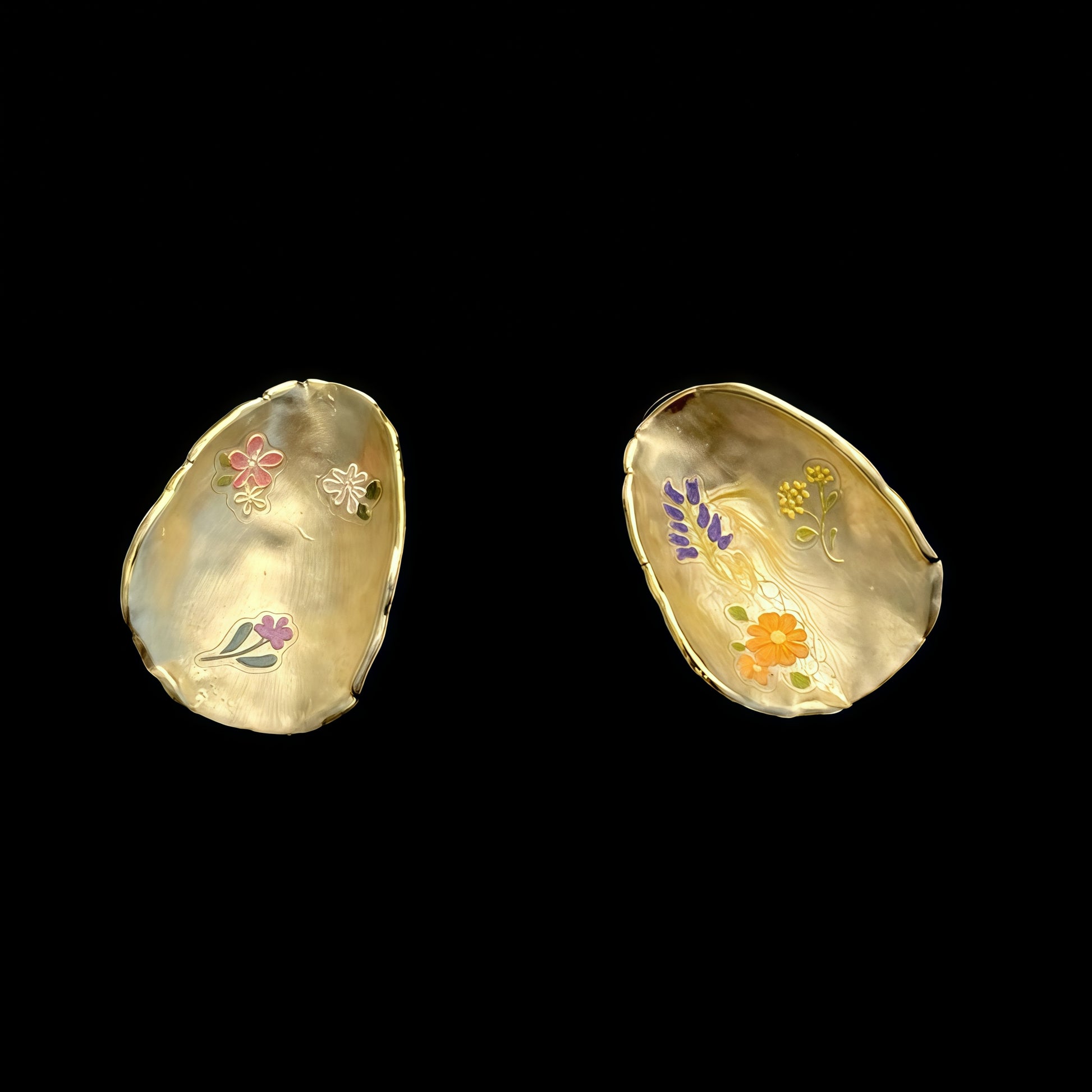 Crafted with a soft, organic silhouette and adorned with tiny painted florals, the Blooming Meadow Shell Earrings capture the quiet poetry of spring held inside a golden shell. Each earring is shaped like a natural, imperfect petal — fluid, asymmetrical, and softly gleaming — with delicate flowers painted in pastel colors: lavender sprigs, daisies, tiny blossoms and tender leaves.