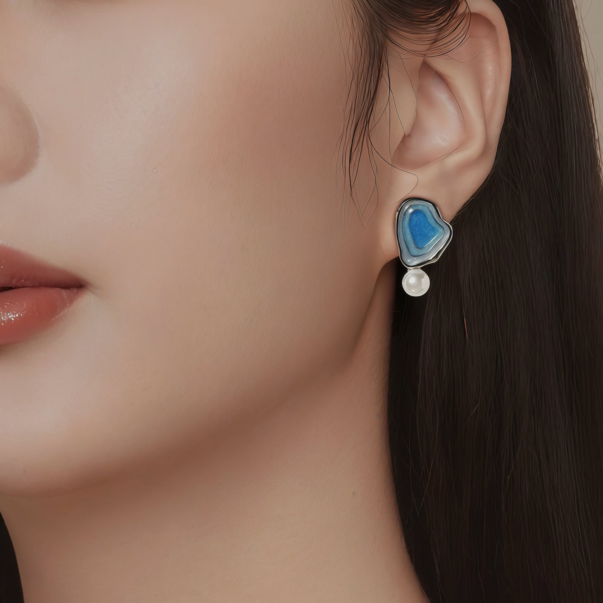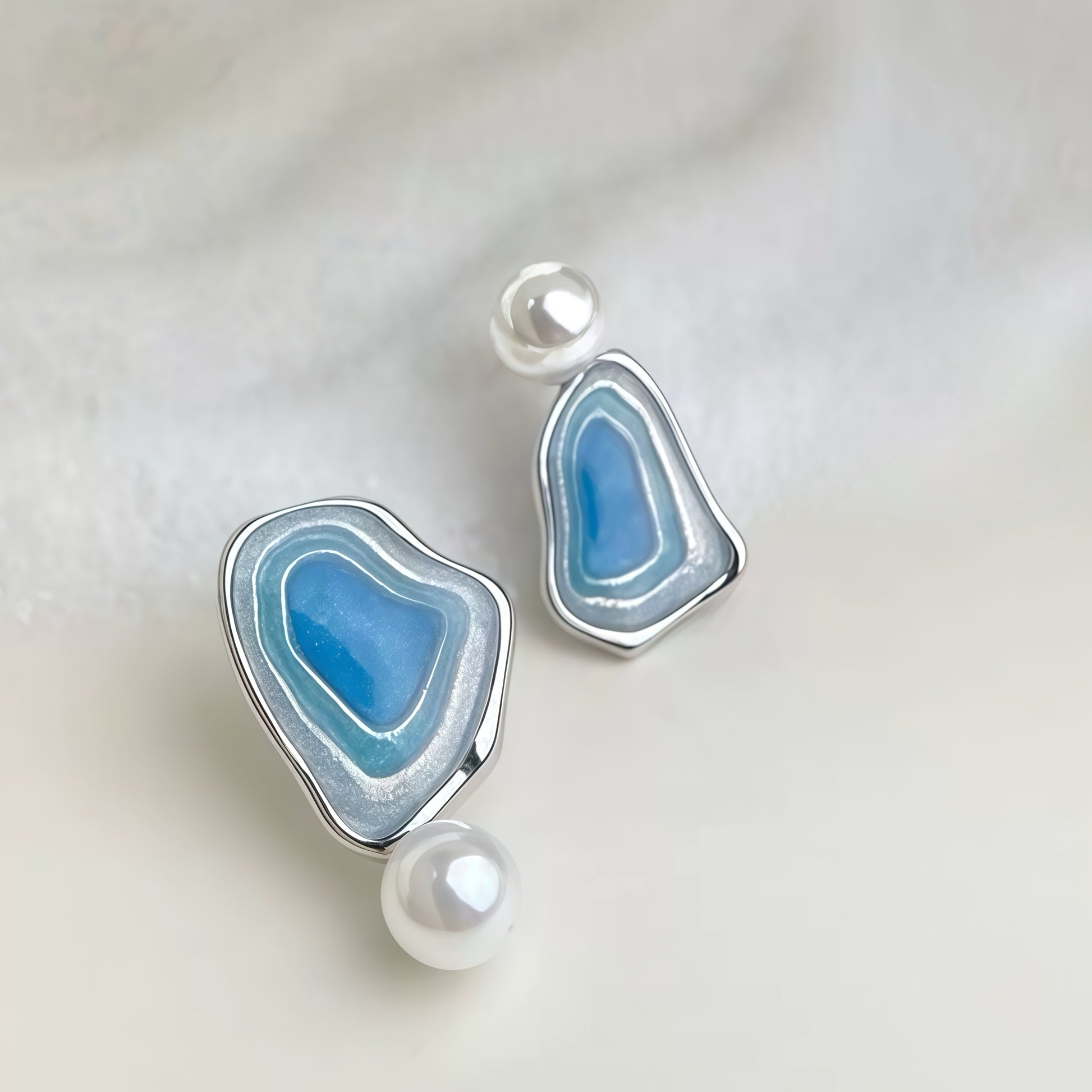 Each earring features an organic, sculptural form with layered blue tones — resembling tidal pools shaped by time. At the base, a luminous pearl rests like a single drop of water, adding balance, movement, and gentle contrast to the cool blue surface.
