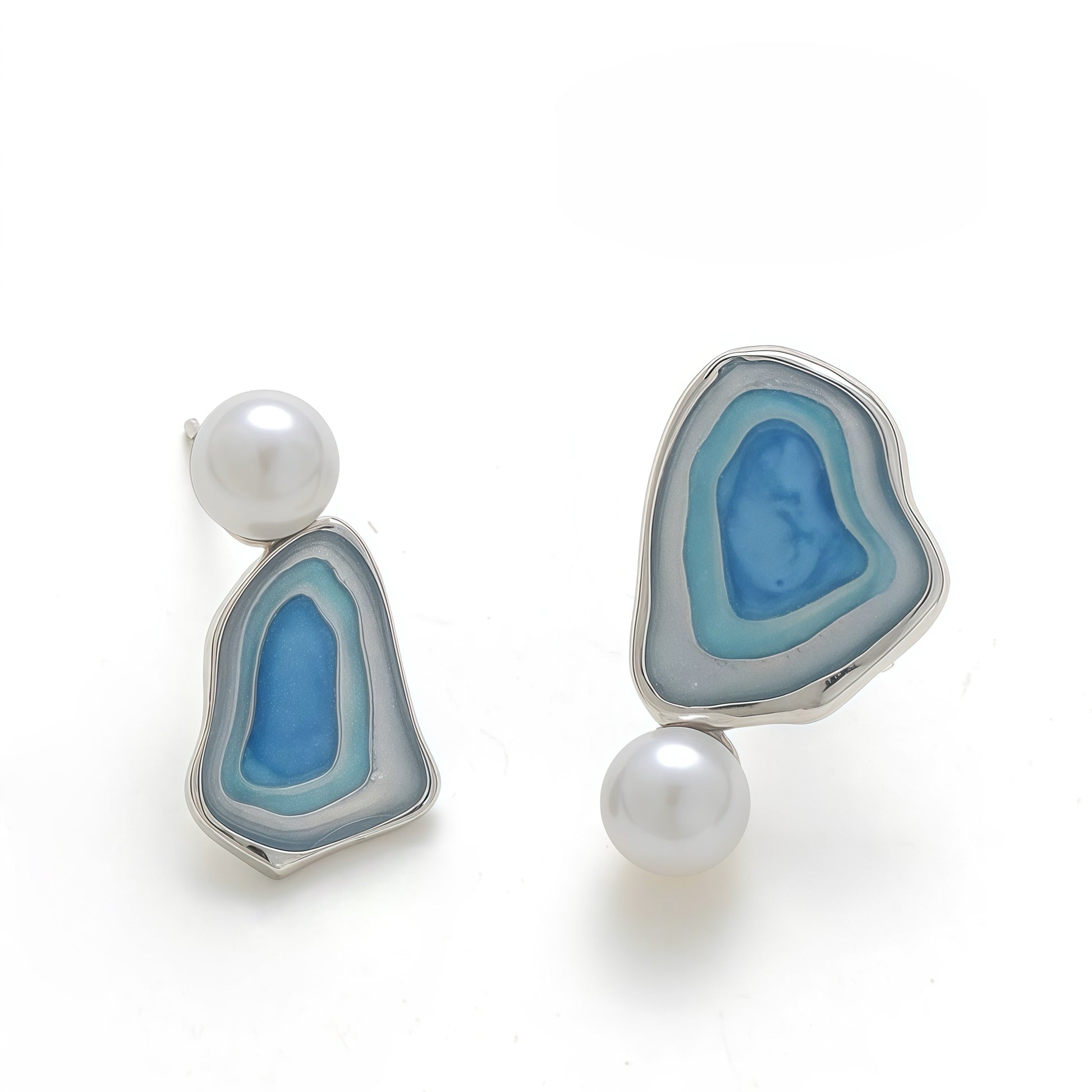 - Material: Silver-tone metal, resin in layered blue hues, pearl accent