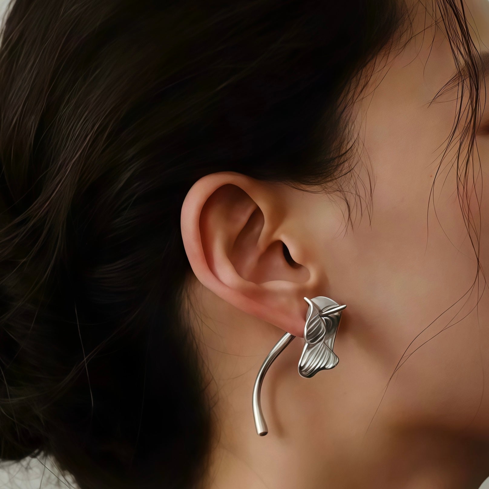 Each earring unfolds like a petal in motion, with fine hand-textured lines that echo the natural veins of a flower. The elongated drop creates a gentle sense of movement, framing the face with understated drama while remaining light and comfortable to wear.