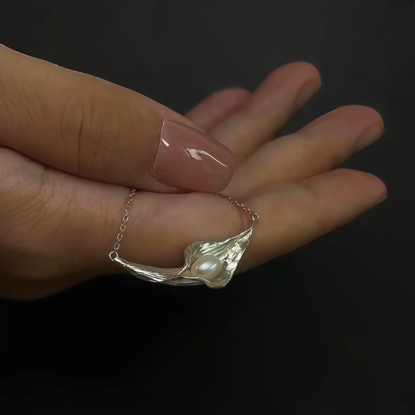 The Calla Whisper Necklace is inspired by the soft unfolding of a calla lily — graceful, fluid, and composed. Sculpted in an organic, wave-like form, the pendant gently cradles a luminous pearl at its center, as if holding a secret not meant to be spoken aloud.