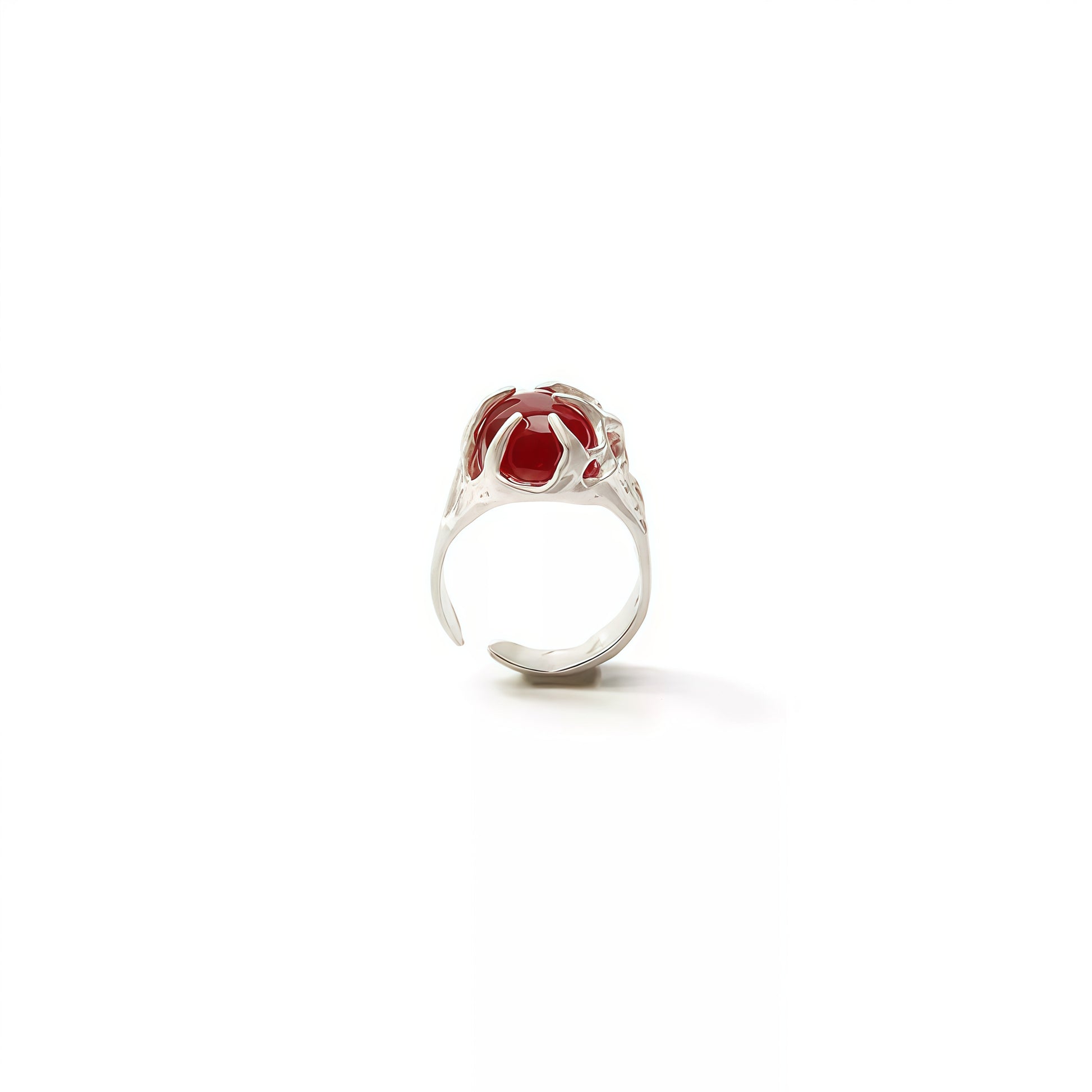 Handcrafted in sterling silver plated brass, its organic structure wraps around a crimson gemstone, evoking both intensity and grace. Every curve and hollow mirrors nature’s untamed artistry — imperfect, powerful, alive.