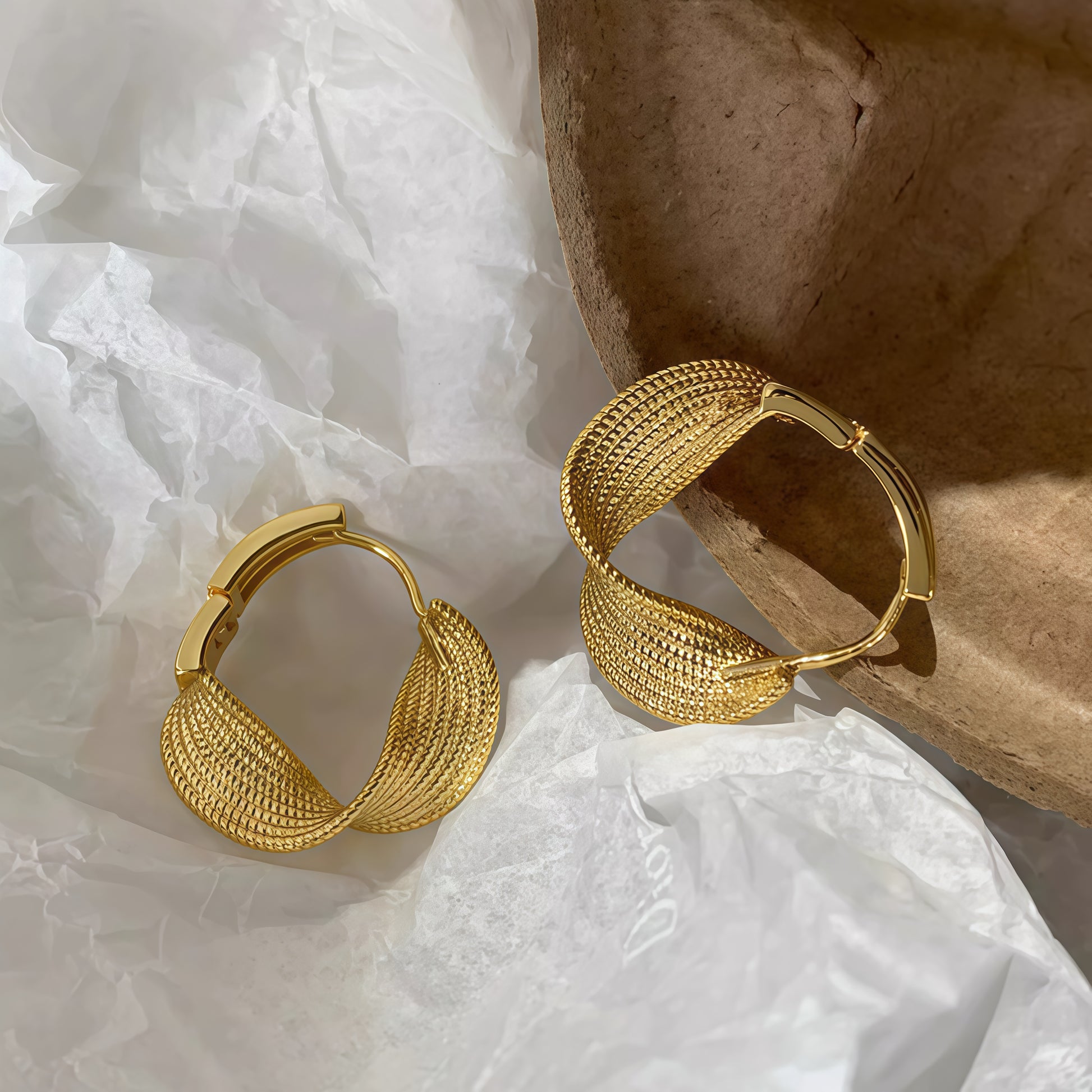 The Eclipse Wave Hoop Earrings are designed with a mesmerizing swirl that evokes the motion of ocean waves and the curve of crescent moons. Each earring features intricate ridged textures that catch the light from every angle, offering both shimmer and depth. The unique twist silhouette creates a bold, dimensional look while remaining lightweight and comfortable for all-day wear.