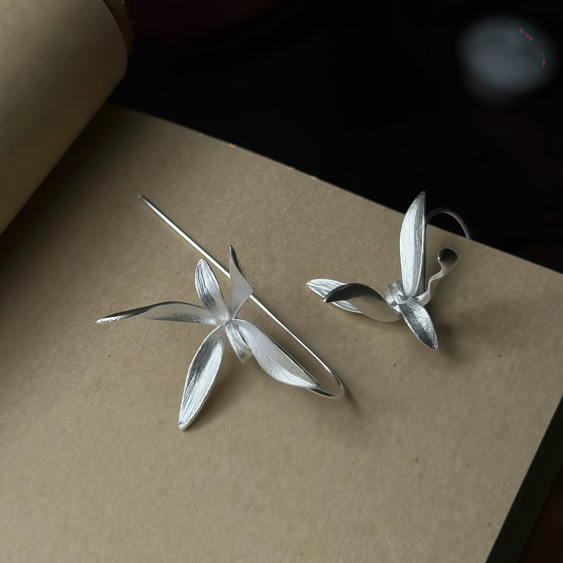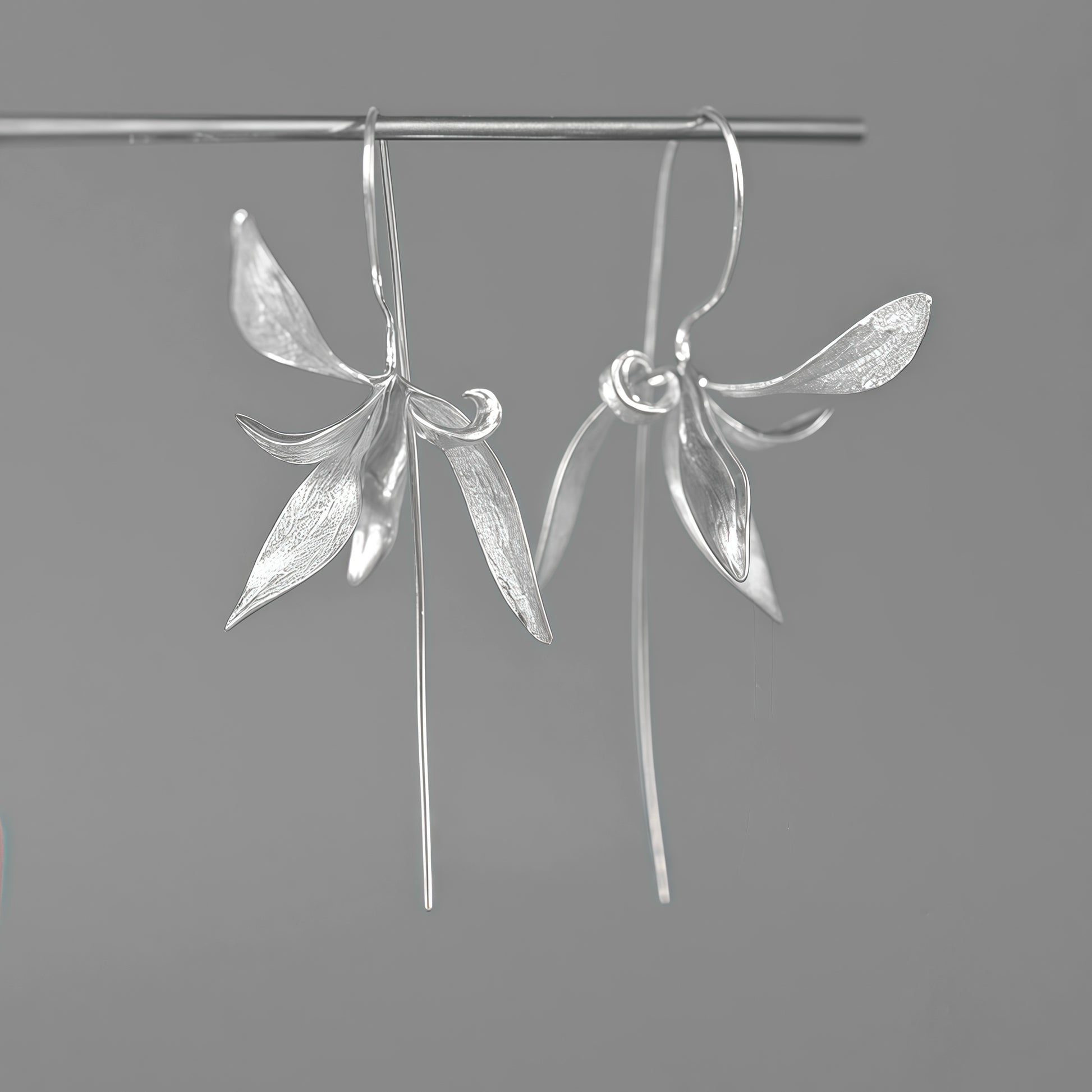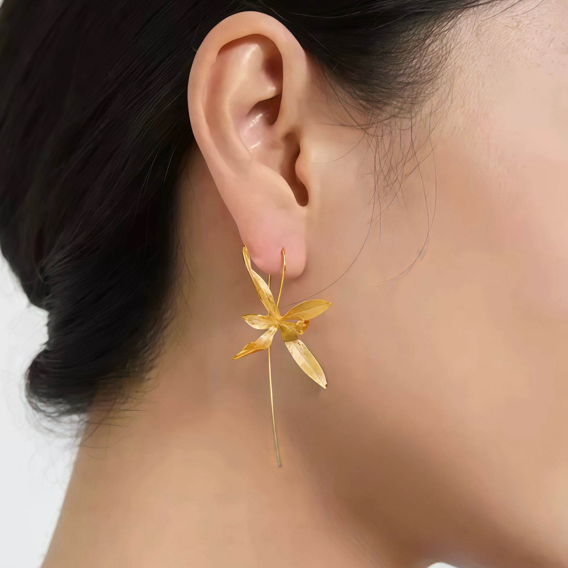 Each petal is individually sculpted and hand-finished with a delicate brushed texture, echoing the natural veins of orchid petals. The elongated stem creates a graceful vertical line, allowing the earrings to sway gently with movement, like an orchid responding to light and air.