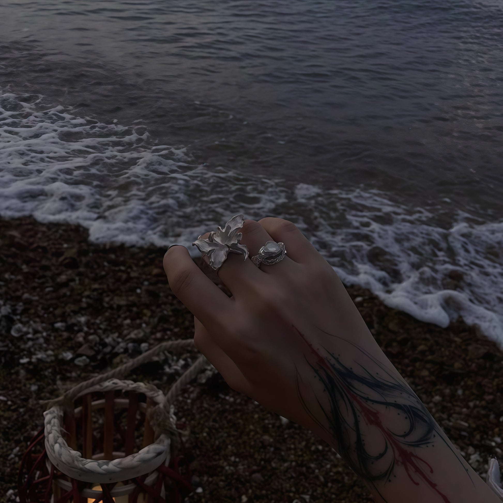 Whether paired with minimalist outfits for a striking contrast or worn as an evening statement, the Iris Whisper Ring embodies timeless elegance and contemporary artistry.