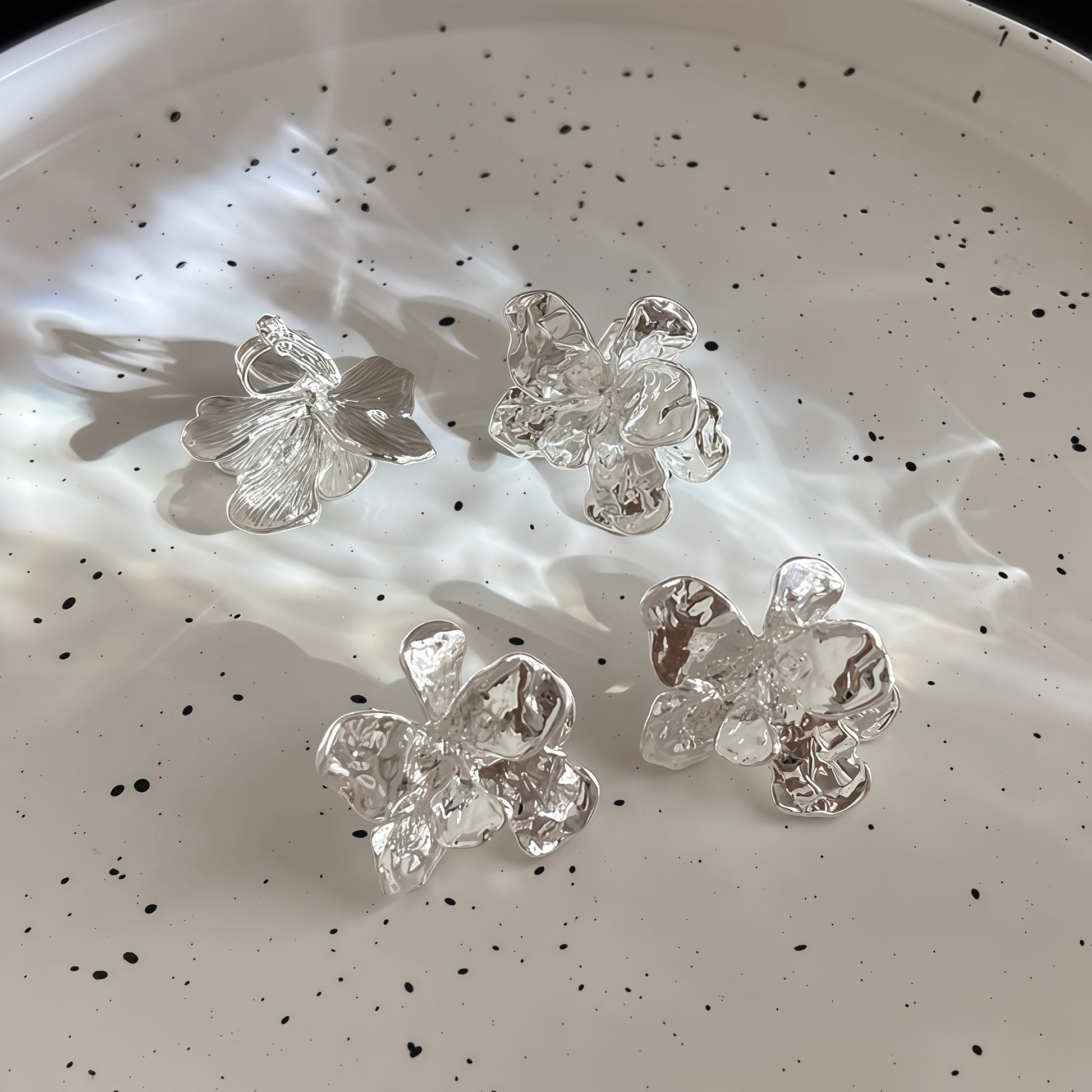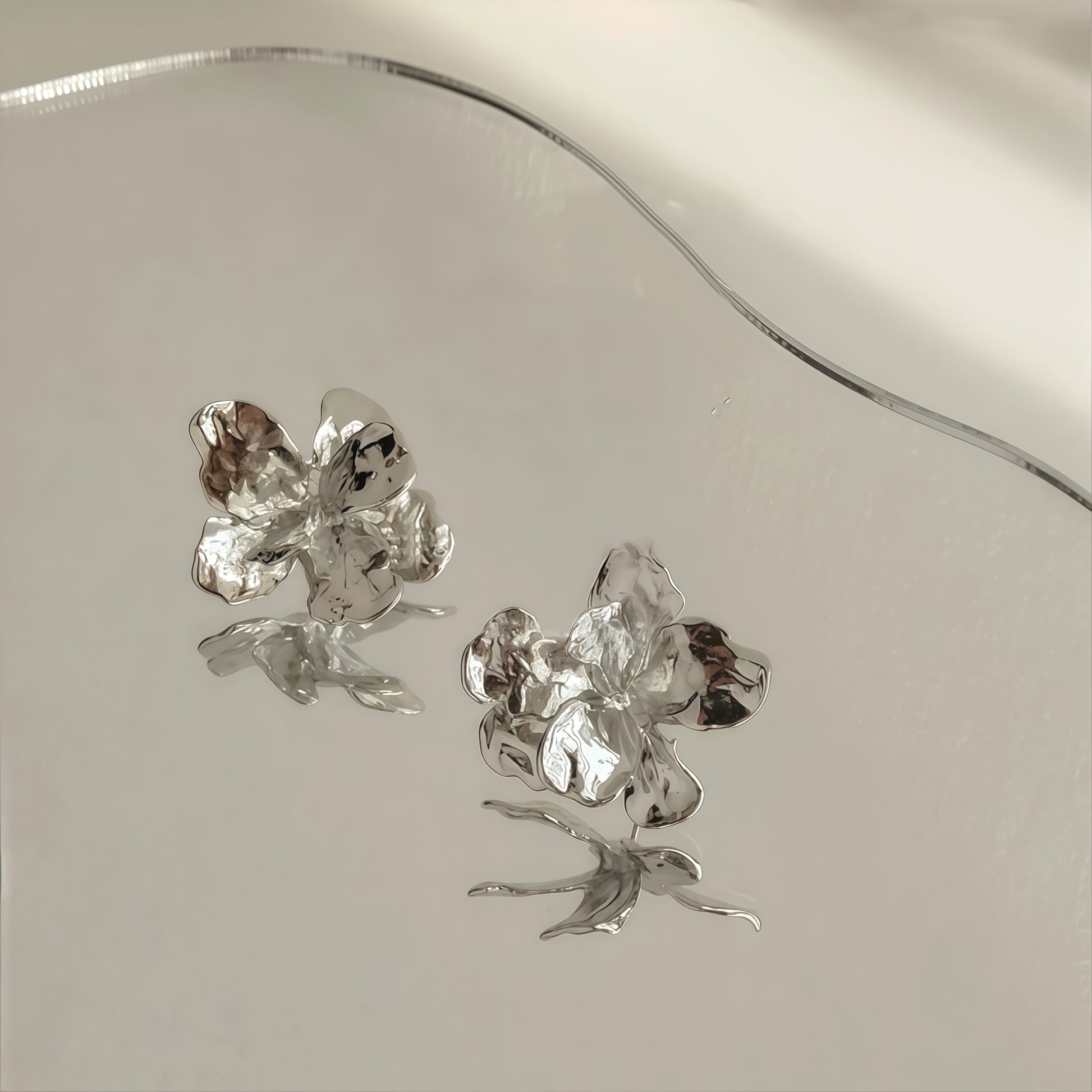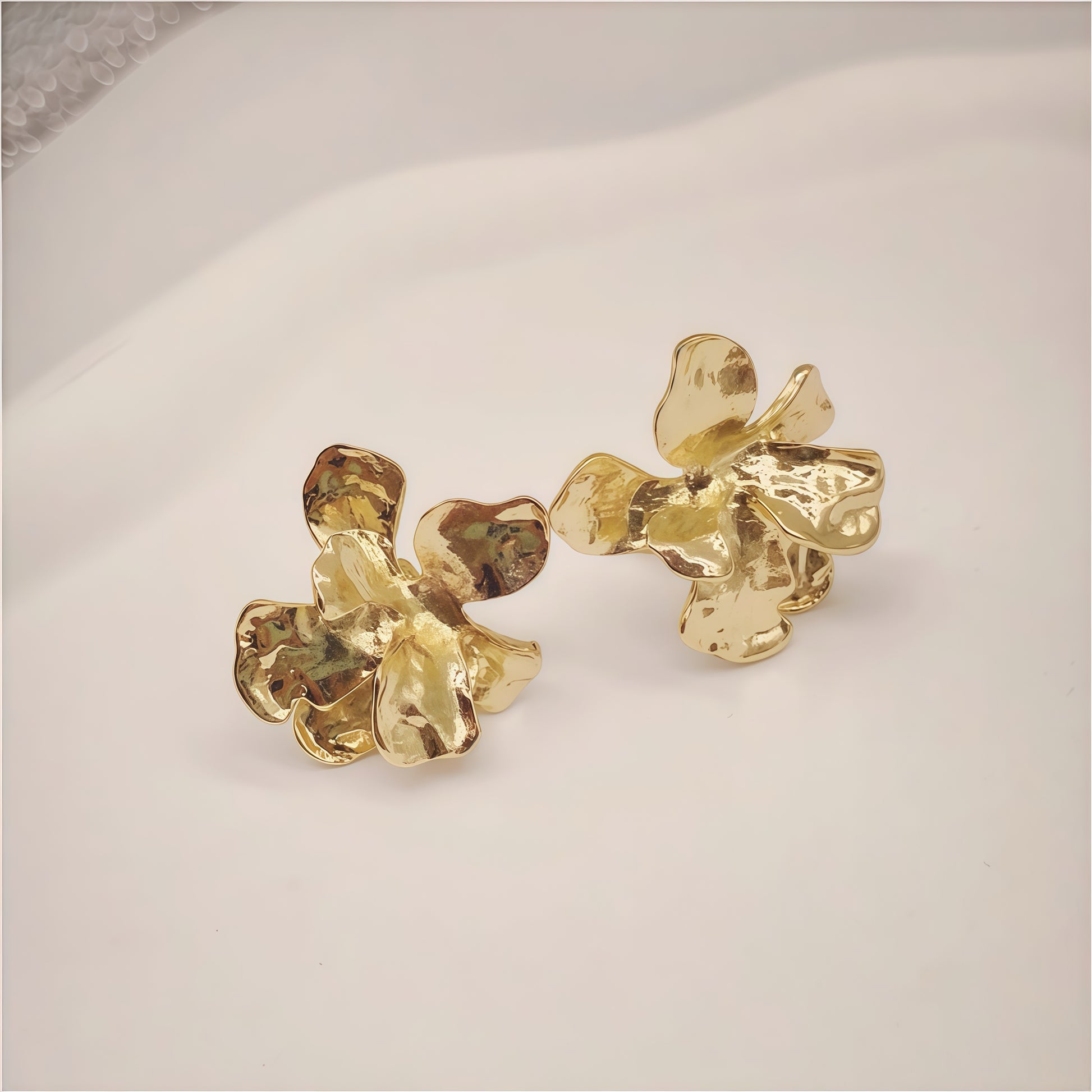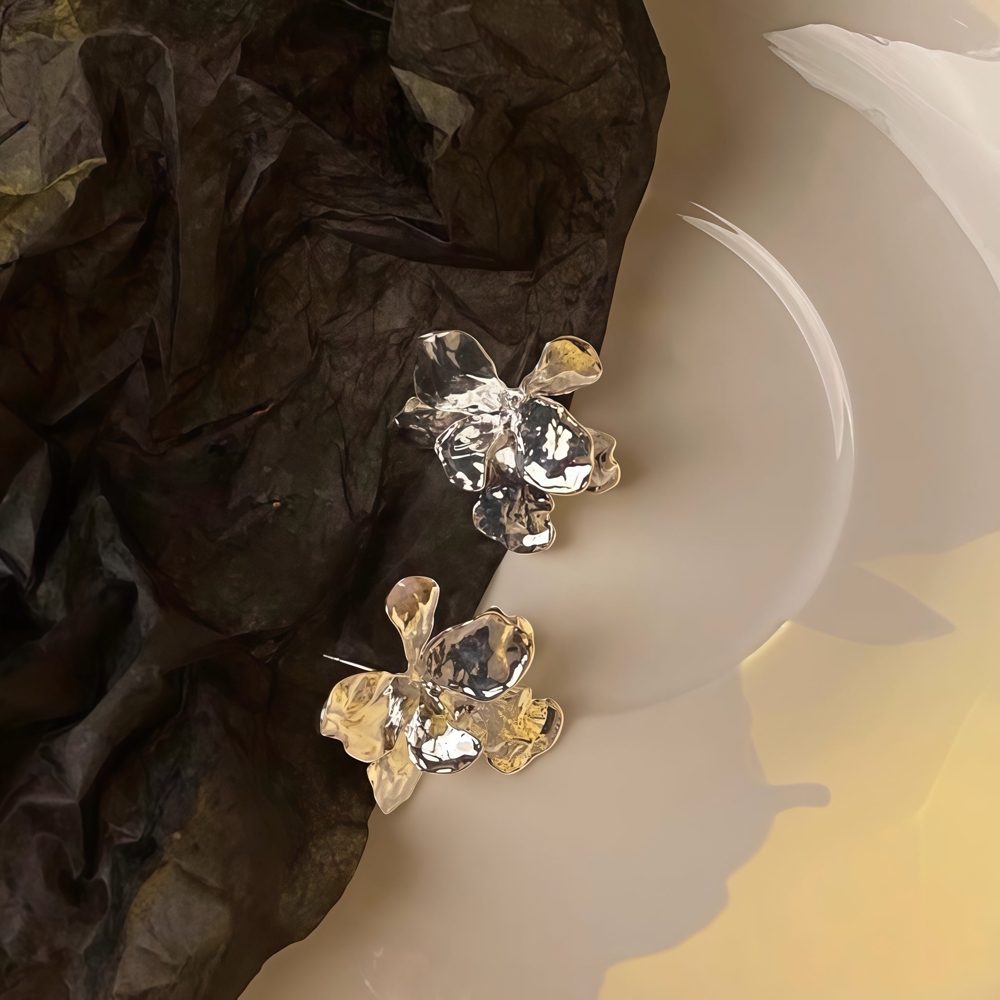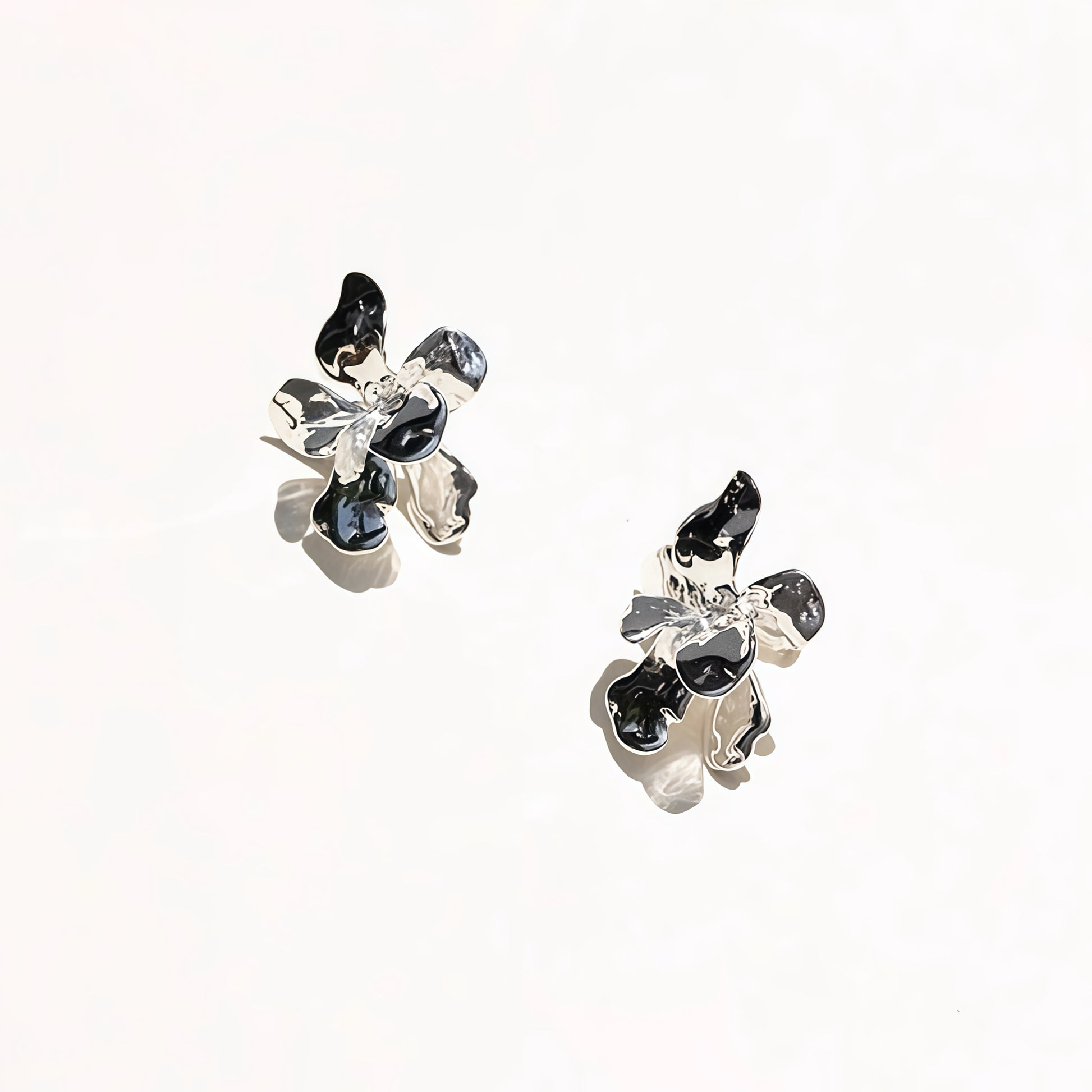 Where modern sculpture meets timeless elegance. The Metallic Romance Earrings feature fluid, petal-like curves with a high-shine metallic finish — available in both gold and silver. Each piece is uniquely molded, reflecting light in captivating ways, making them the perfect statement for day or night.
