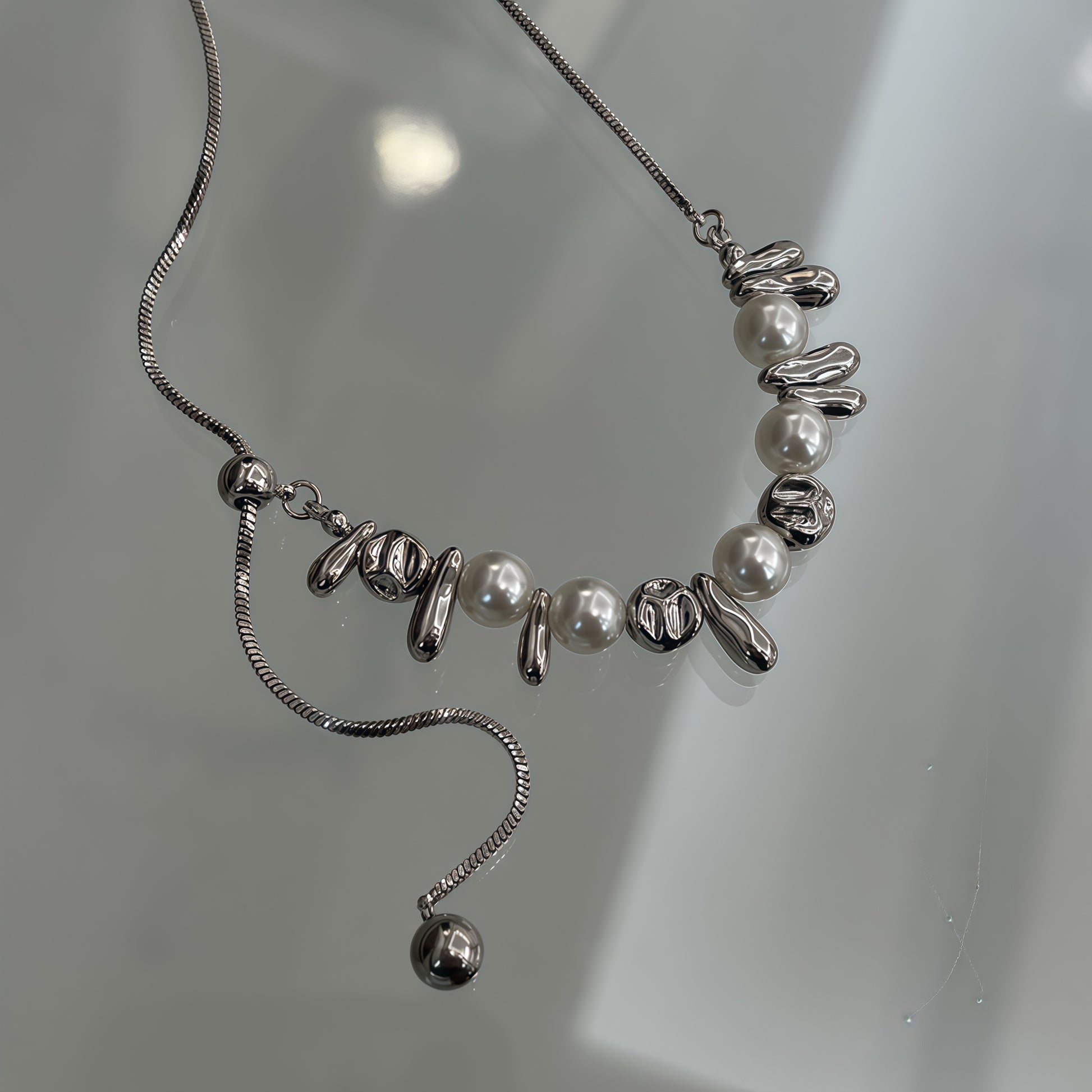 Elevate your everyday elegance with our Modern Pearl Sculpture Necklace, where classic pearls meet bold, sculptural silver forms. This statement necklace features lustrous white faux pearls interspersed with abstract, organic silver-tone elements that reflect light from every angle. Designed with a sleek snake chain and adjustable lariat-style drop, it allows for personalized styling — wear it centered or asymmetrical for a contemporary twist.