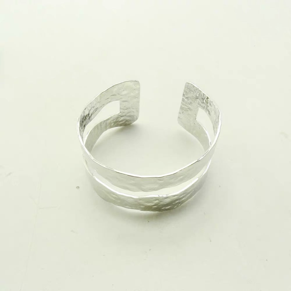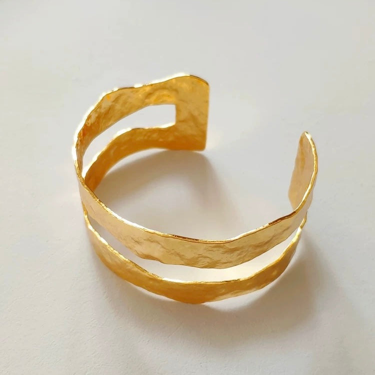 Inspired by the raw beauty of untamed landscapes and ancient artisan techniques, the Nomad Bangle is a sculptural piece that speaks to the soul of the wanderer. Featuring a double-layered open cuff design with hand-hammered textures and cut-out side accents, it embodies movement, freedom, and earthy elegance.