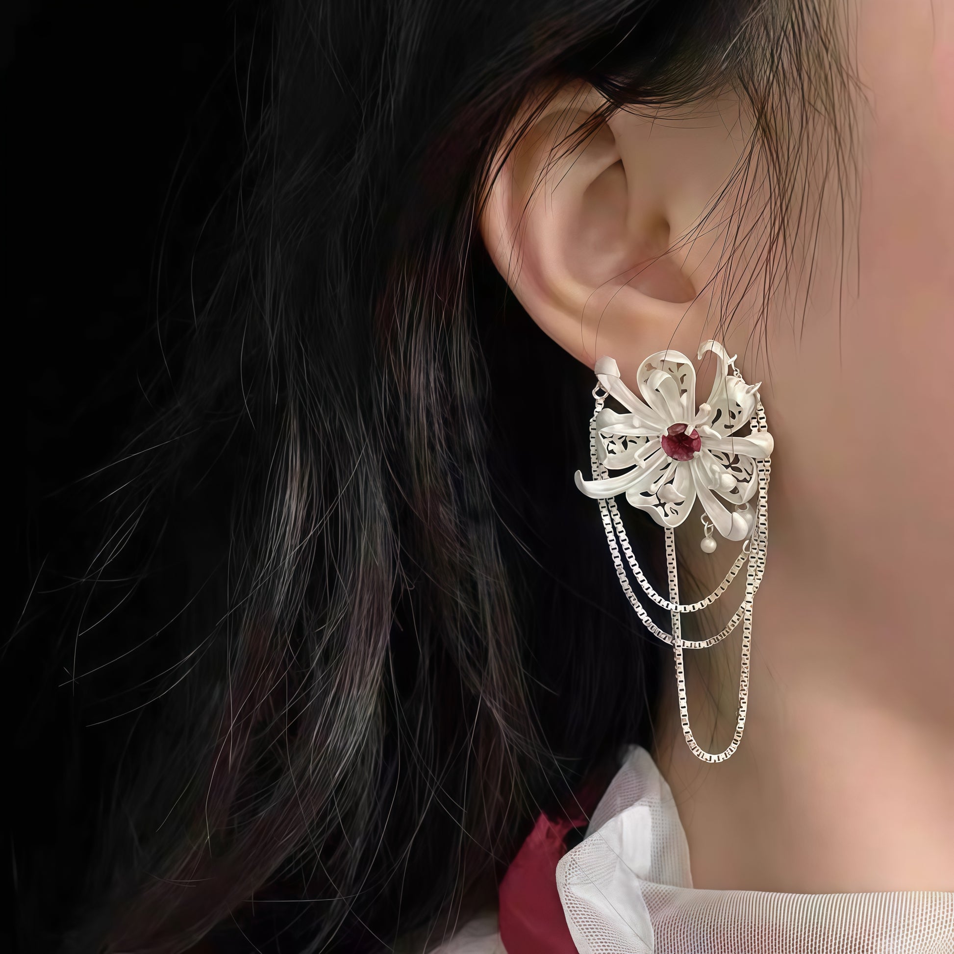 Poetic Bloom Earrings – Silver Floral Statement Earrings with Chain Drapes