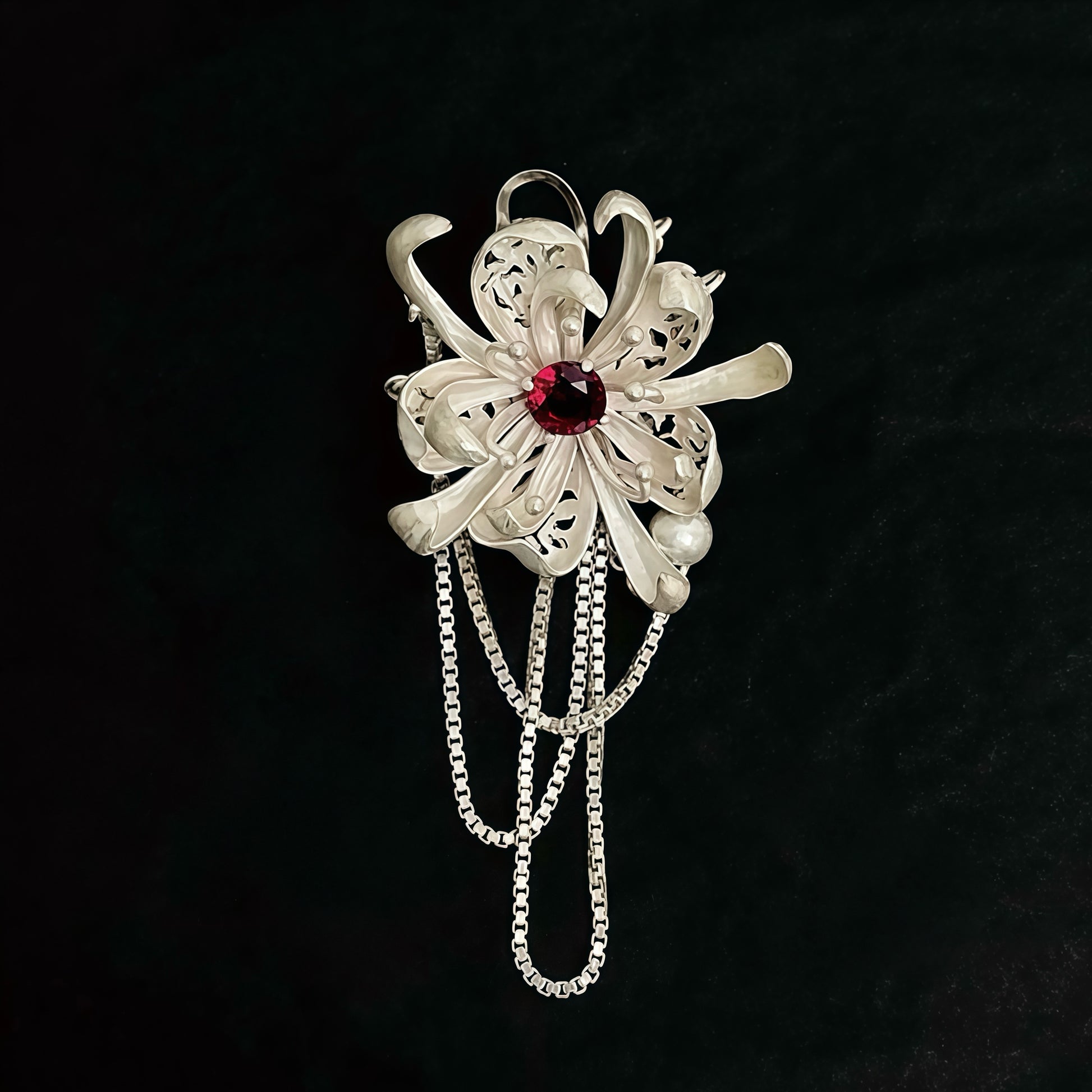 Delicate silver chains fall gently from the bloom, creating soft movement with every step. The drape is fluid, almost weightless, adding a sense of rhythm rather than drama — subtle enough for refined wear, yet expressive enough to be remembered. Pearl accents complete the composition, balancing strength and softness, structure and flow.