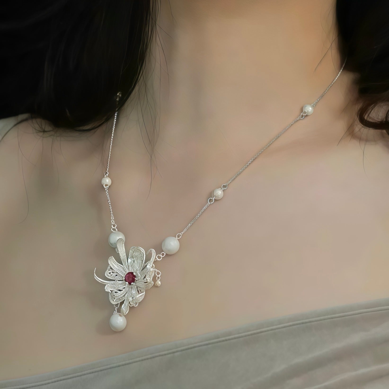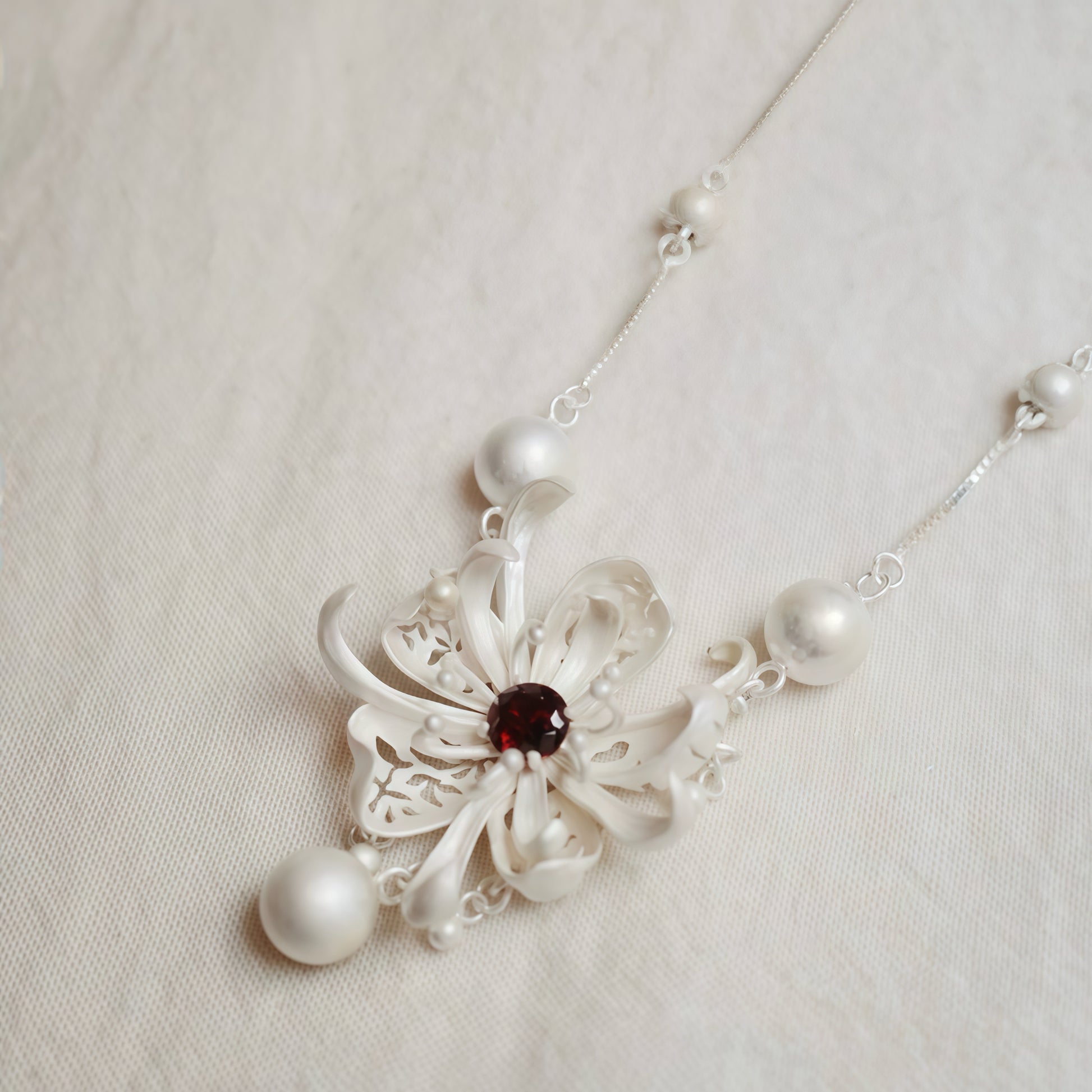 Inspired by a flower caught mid-bloom, this necklace captures a quiet moment of strength and softness. Sculpted petals unfold in layered curves, each delicately hollowed to let light pass through, creating a sense of movement even when worn still. At the heart of the flower, a deep red gemstone glows like a held breath — subtle, intense, and quietly powerful.