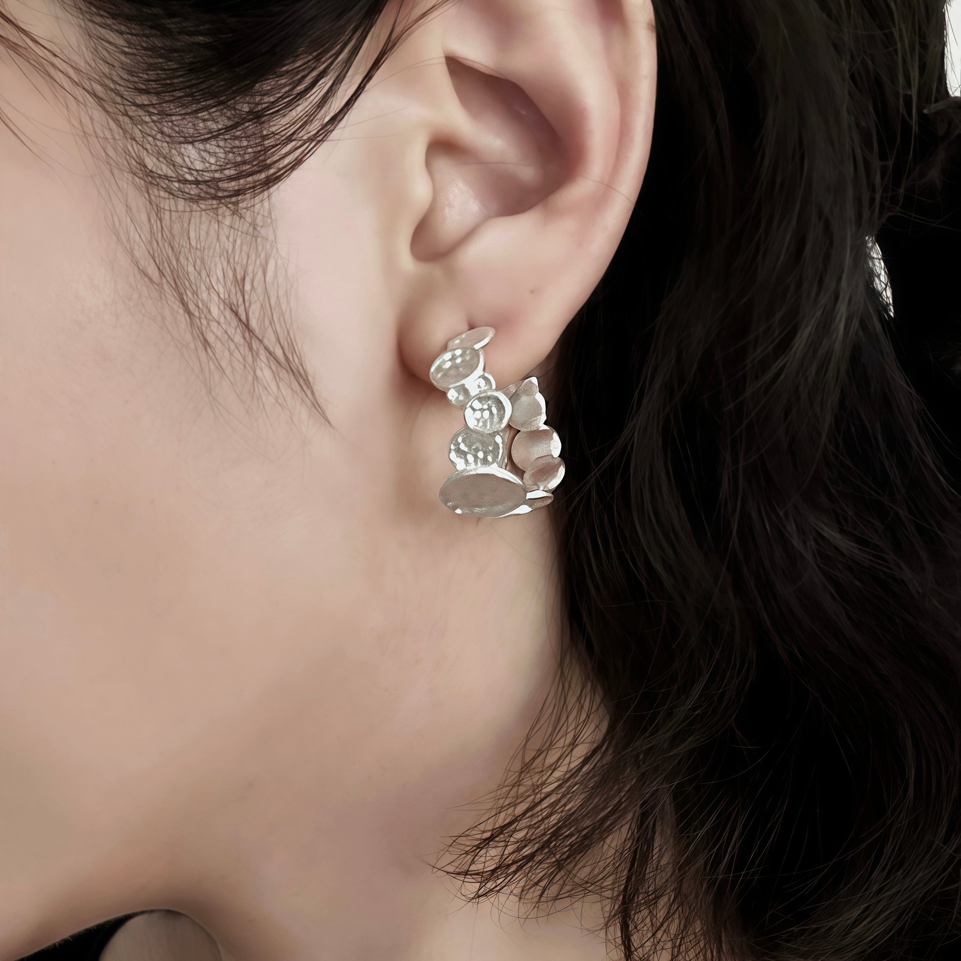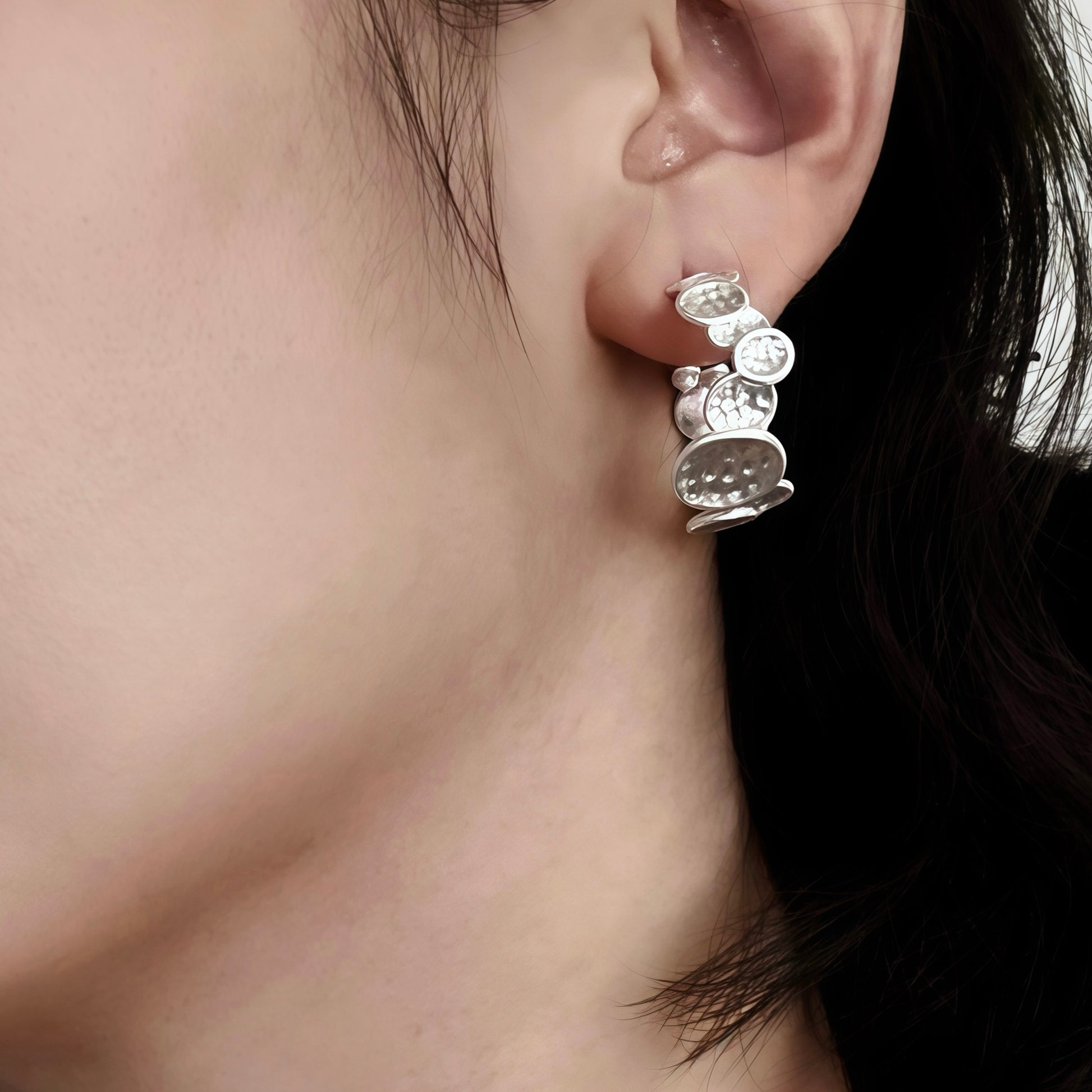 Inspired by the quiet poetry of ripples on a still lake, this design blends Scandinavian minimalism with artistic texture, creating a statement piece that feels both modern and timeless. The layered discs form a sculptural silhouette that wraps gently around the ear, giving the hoops dimension, depth, and an effortless sense of motion.