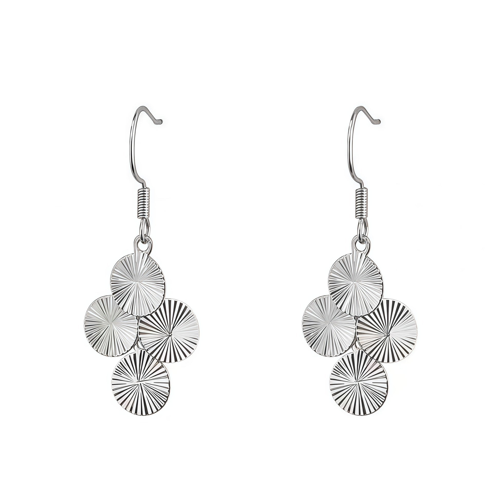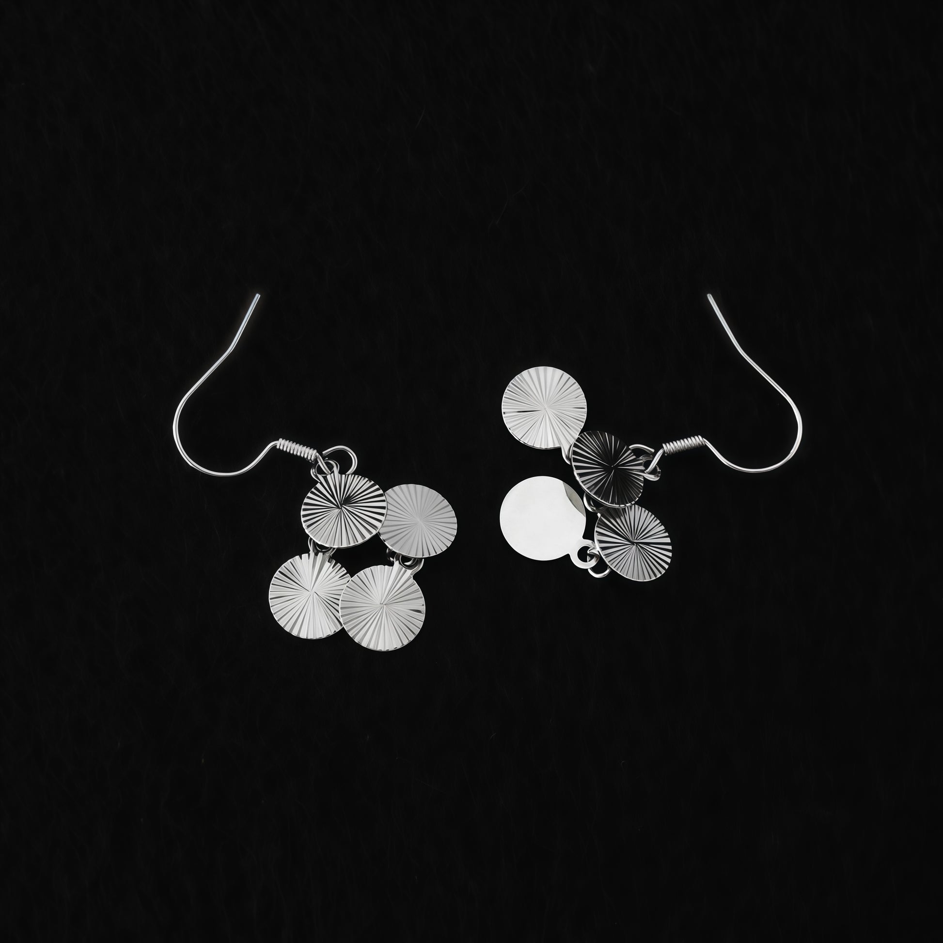 Quietly striking, these silver drop earrings are composed of layered circular discs, each engraved with fine radial textures that catch and reflect light from every angle. As you move, the discs shift gently against one another, creating a soft shimmer — subtle, rhythmic, and alive.