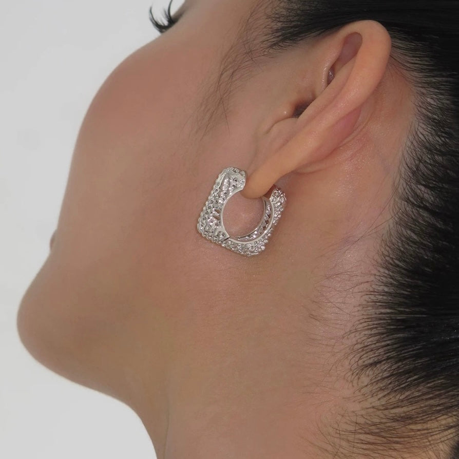 Crafted in high-polish silver, these chunky earrings feature a structured, textured surface that reflects light with every movement. The unique square silhouette adds a modern twist to the classic hoop, perfect for those who embrace artful minimalism.