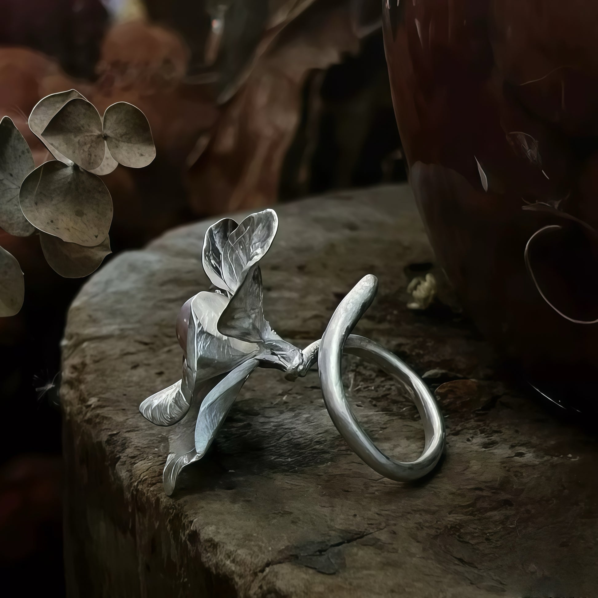 Hand-formed in high-quality sterling silver plated brass, each petal carries delicate textures, curves, and shadows that echo the grace of real blossoms. At its center rests a luminous natural pearl, adding a gentle glow that shifts beautifully with the light. No two pieces are ever the same — each ring is slightly different, shaped by hand, shaped by intention.