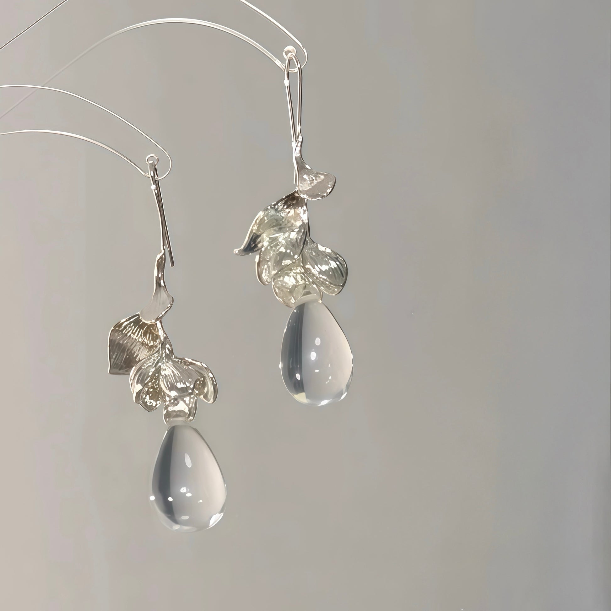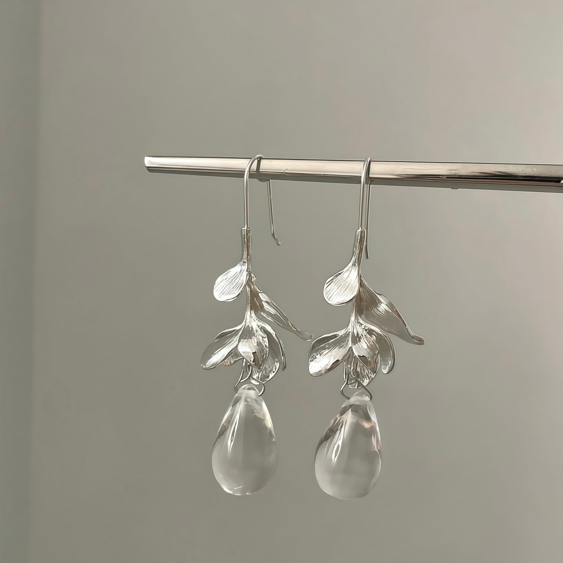 These handcrafted earrings feature delicate silver leaves cascading into a luminous dewdrop-shaped crystal. Inspired by early morning mist on garden foliage, their organic flow and gentle shimmer bring a poetic softness to your look. Lightweight yet eye-catching, they dance with your every movement — a quiet statement of grace and strength.