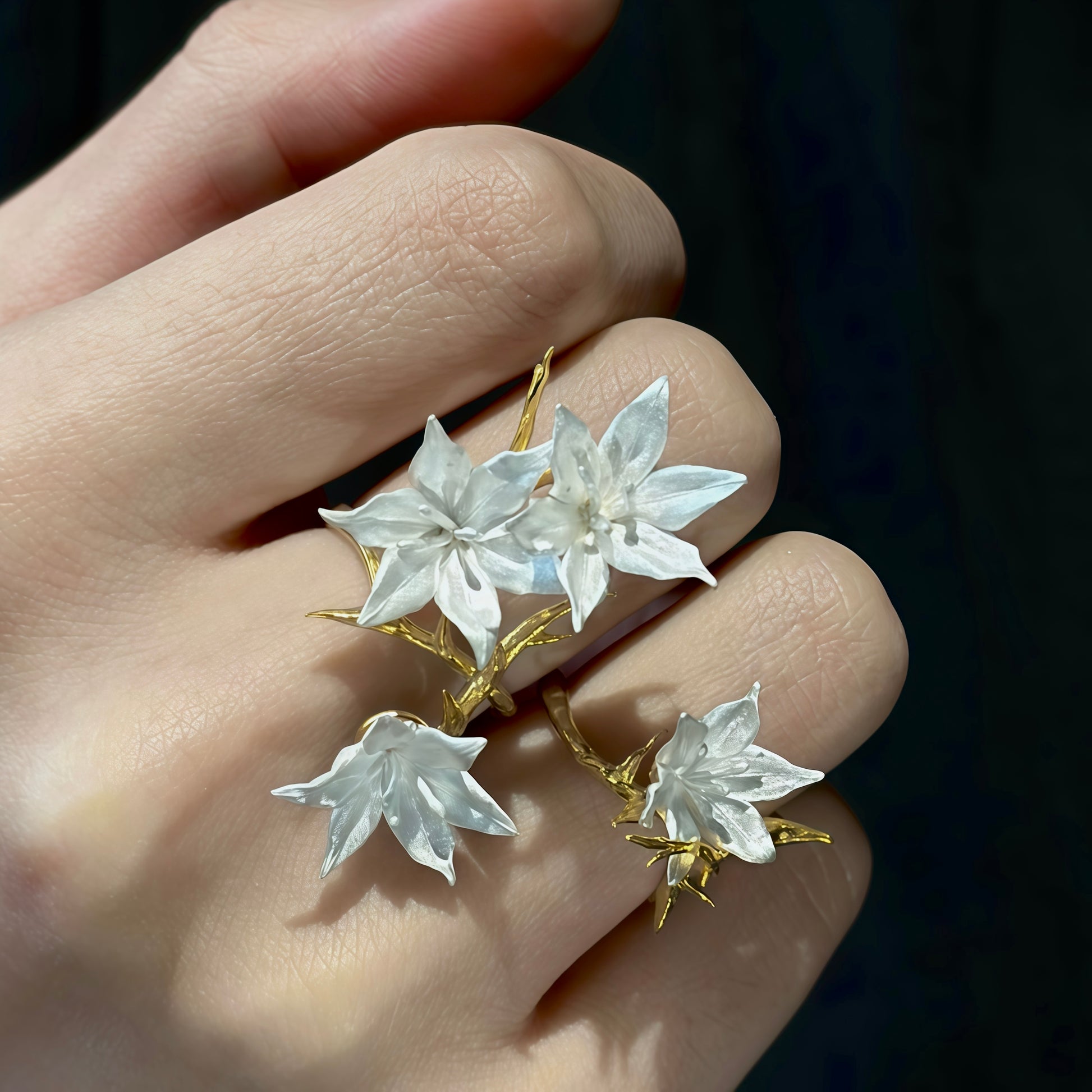 Inspired by the delicate beauty of lilies blooming fearlessly among thorns, the Thorned Lily Ring captures the union of elegance and resilience. Each piece is meticulously crafted in solid silver, plated in luminous gold, and adorned with hand-sculpted white lilies that blossom against golden thorn-like branches.