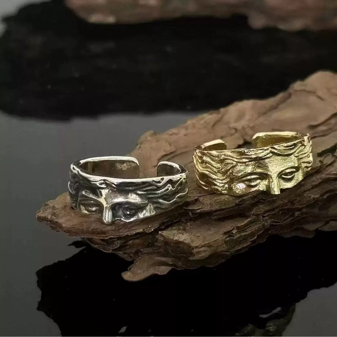 Unveil the gaze of a goddess. The Venus Eyes Ring is a sculptural tribute to Venus, the Roman goddess of love and beauty. Cast in antique silver or brushed gold, this ring captures a fragment of divine grace — her calm eyes, flowing hair, and timeless allure — as if rediscovered from ancient marble ruins.