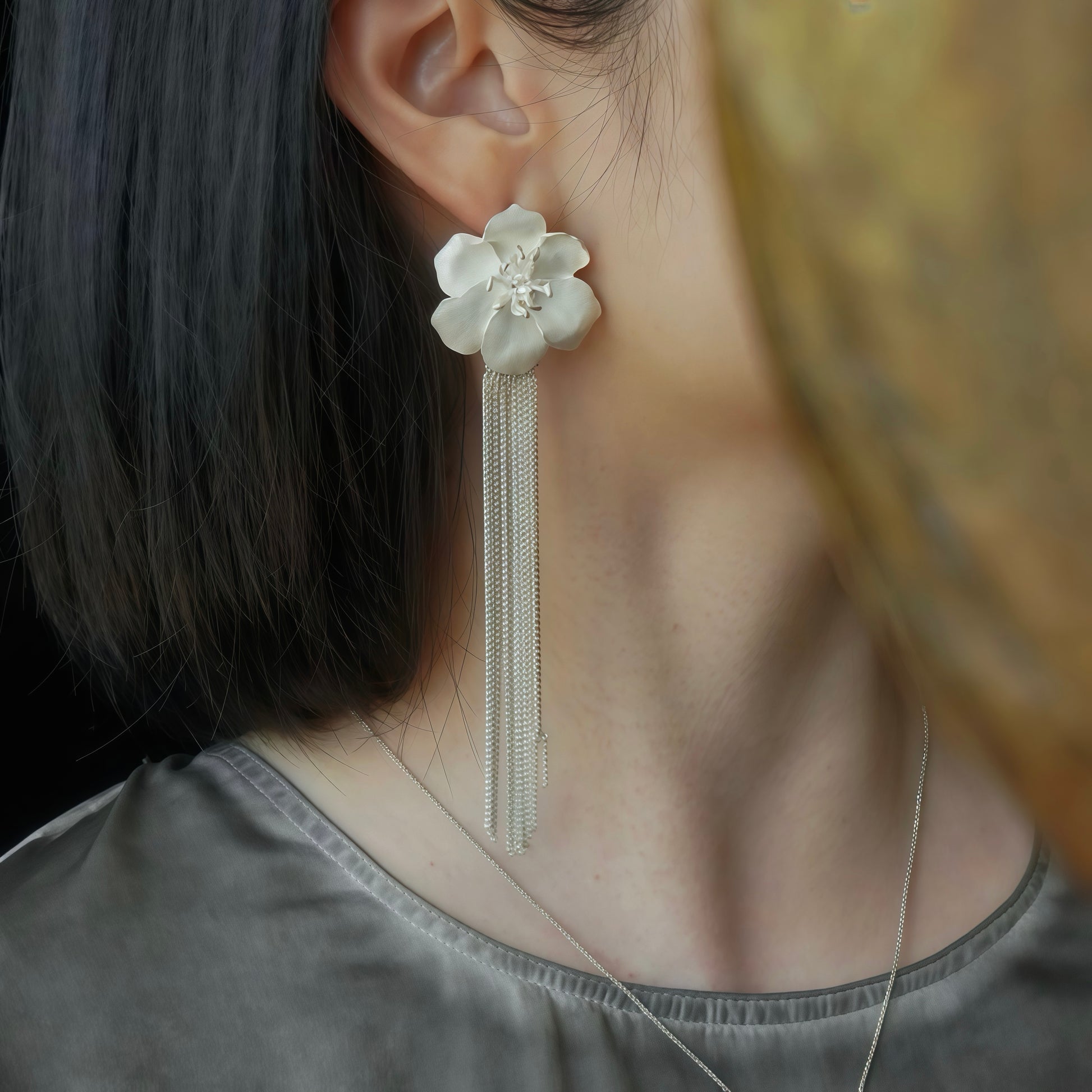 At the center is a hand-sculpted white blossom, its soft petals resting gently against the skin. Worn alone, it becomes a refined floral stud — calm, minimal, and intimate. Add the detachable silver tassels, and the piece transforms: fine chains fall like flowing breath, catching light and movement with every step.