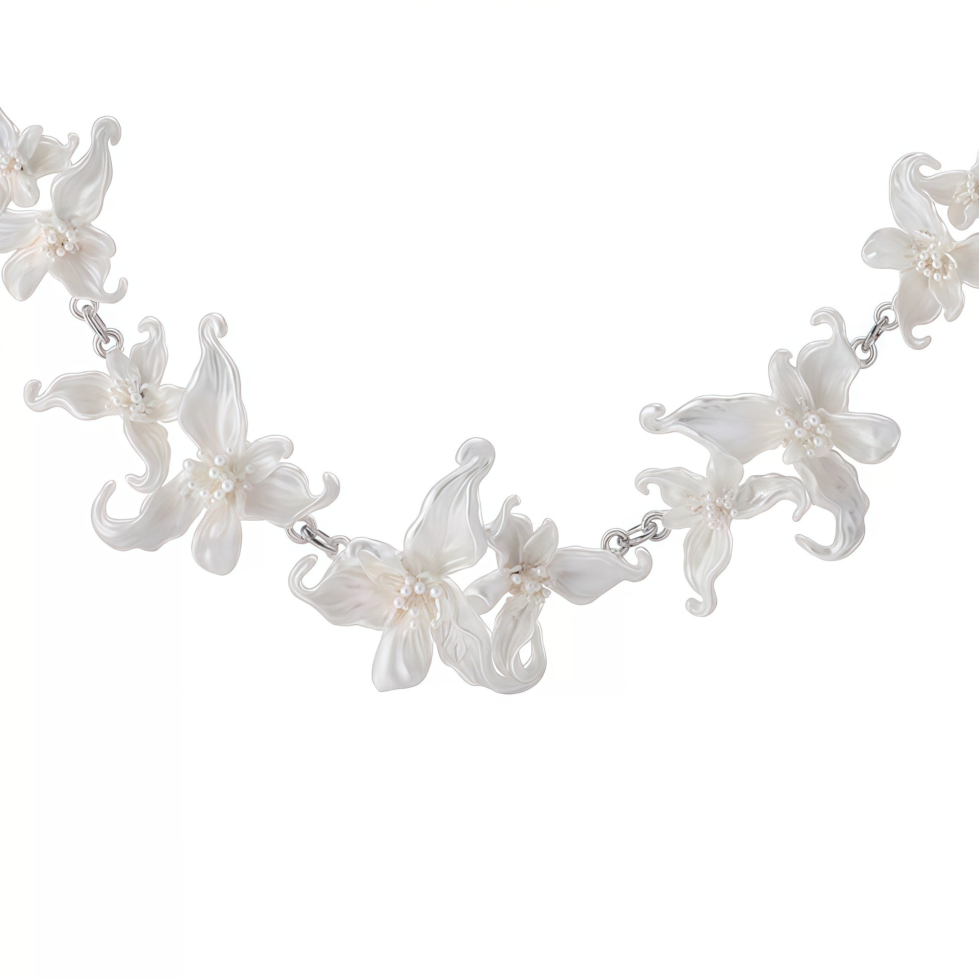 Designed to rest gently along the collarbone, the necklace creates the illusion of flowers floating on the skin, connected by a refined silver-tone chain. It is romantic without being delicate, expressive without being loud — a statement piece for women who carry both softness and strength within them.