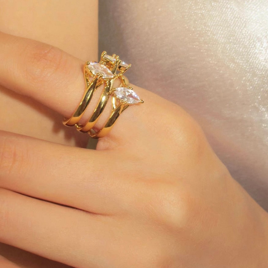 A sculptural statement for those who dare to shine — the Celestial Cascade Ring is a three-band stunner adorned with marquise-cut stones that catch light from every angle. Designed to appear like fluid movement frozen in time, each crystal is perched elegantly atop intersecting bands that wrap around your finger like flowing energy.