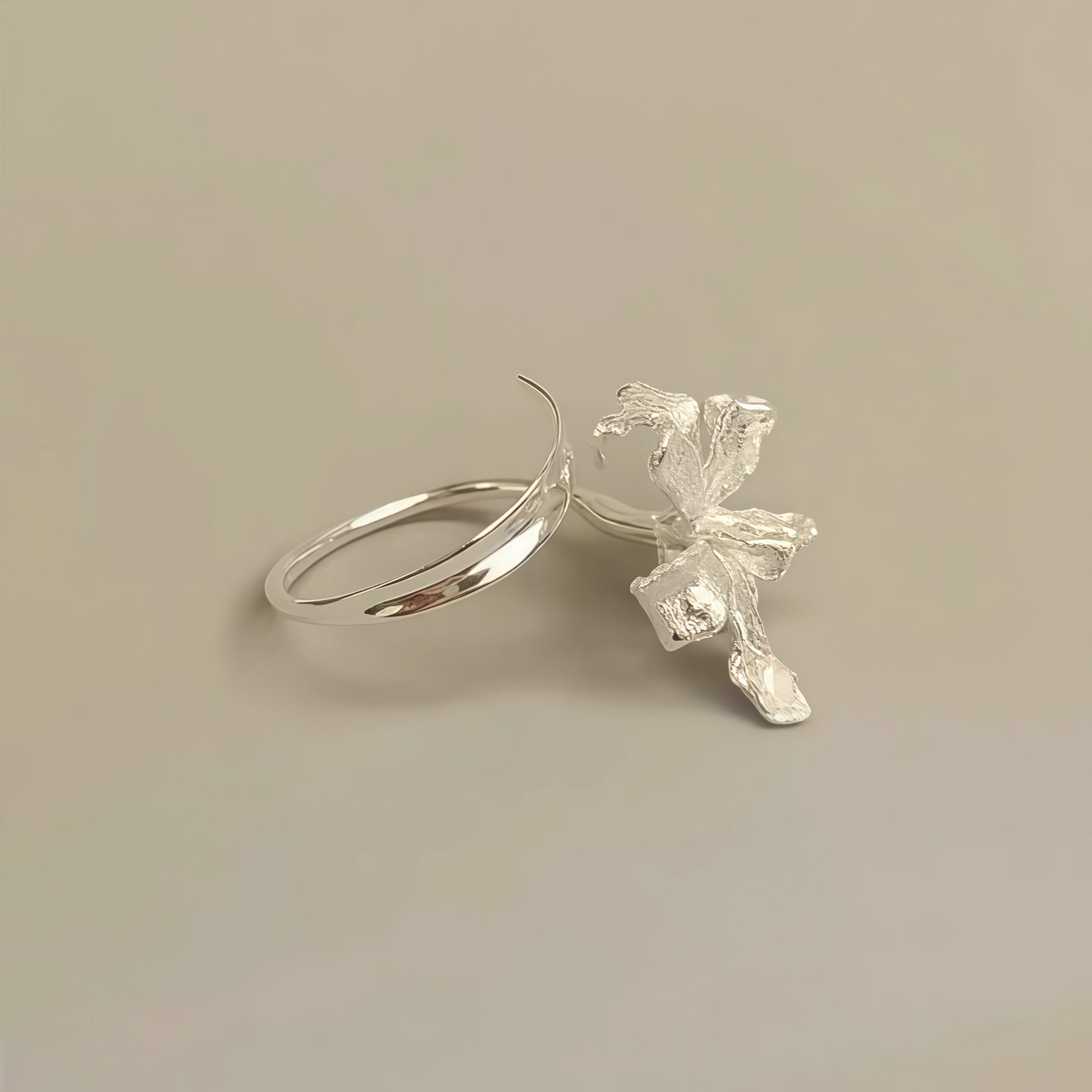 Ringen har en delikat men djärv design: texturerade kronblad i strålande sterlingsilver eller självlysande guldplätering reser sig från ett polerat silverband och skapar en luftig, skulptural silhuett som känns lika lätt som den ser ut.