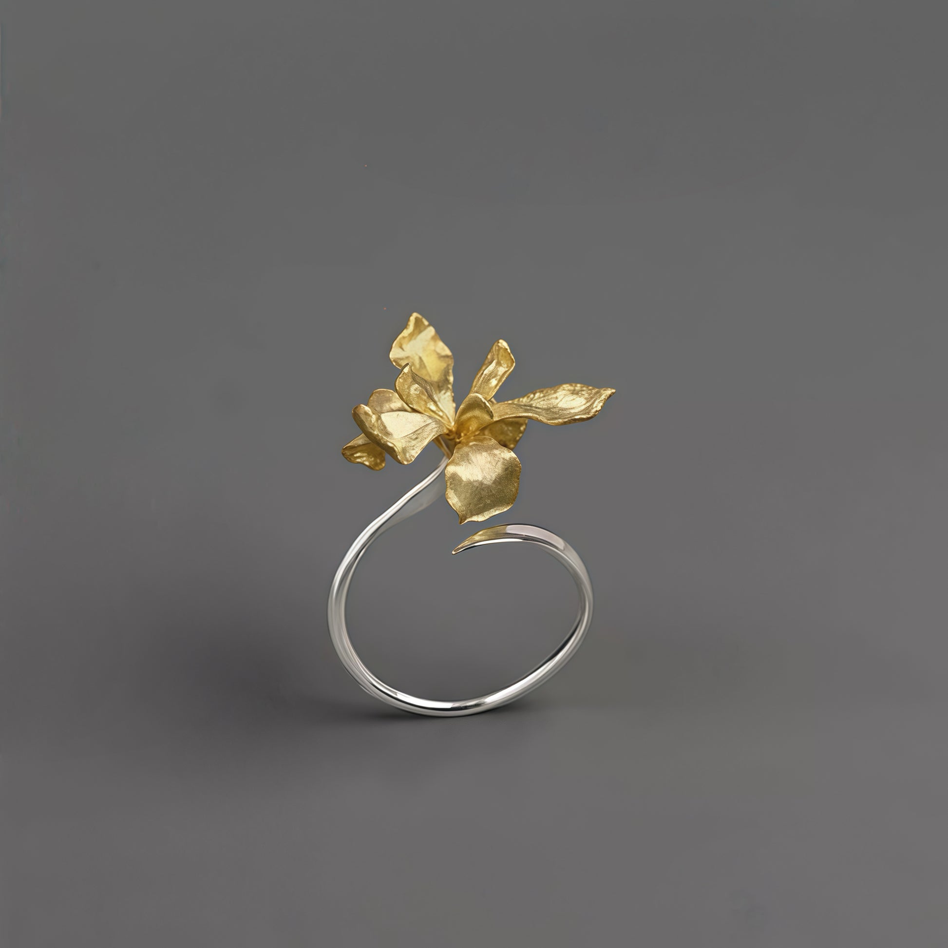 Inspirerad av irisblommans graciösa form fångar Iris Bloom Ring naturens tysta drama i ett bärbart konstverk. Handgjord med noggrann detalj, är varje kronblad skulpterat för att efterlikna de flytande, organiska kurvorna hos en blommande iris – en symbol för visdom, hopp och förnyelse.