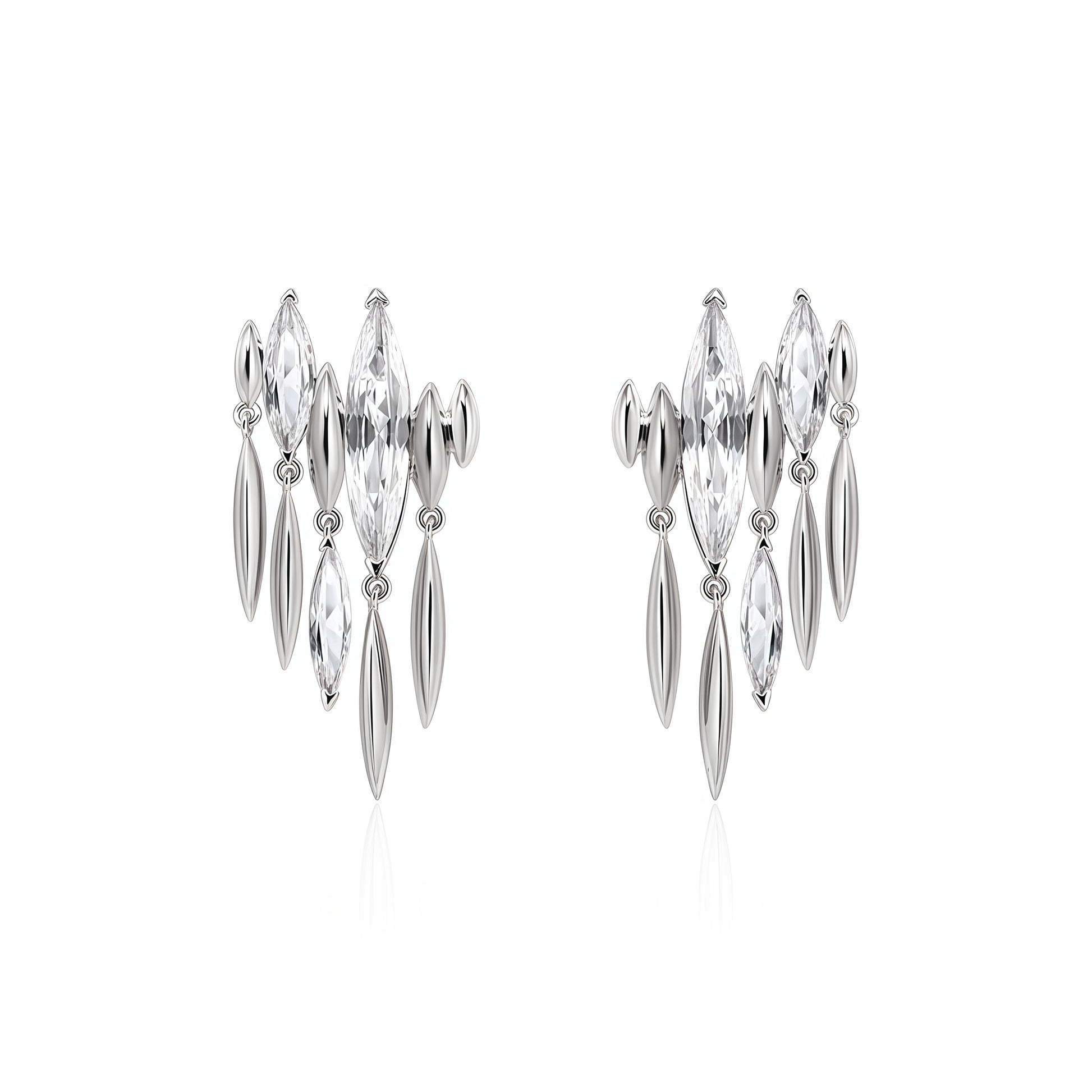 Kliv in i rampljuset med Eclipse Radiance-örhängena, där djärv elegans möter kosmisk briljans. Dessa iögonfallande örhängen är tillverkade med avlånga marquiseslipade zirkoniastenar och högglanspolerade silverdroppar, arrangerade i en kaskadliknande konstellation som skimrar vid varje rörelse.